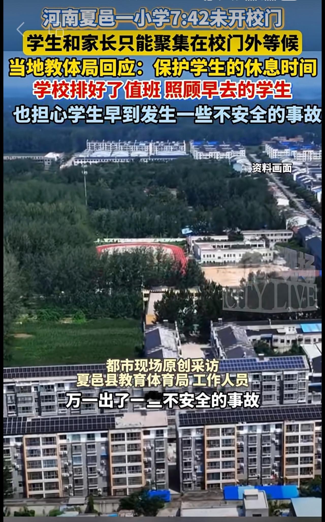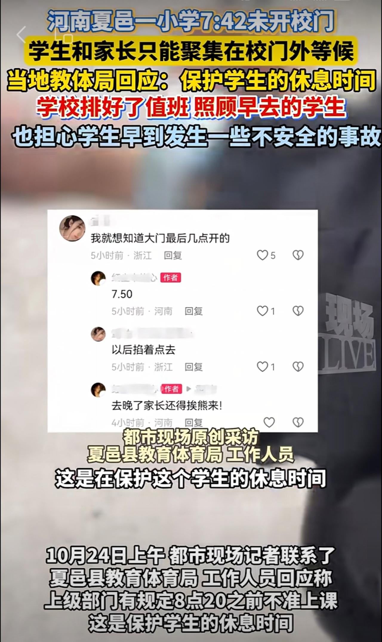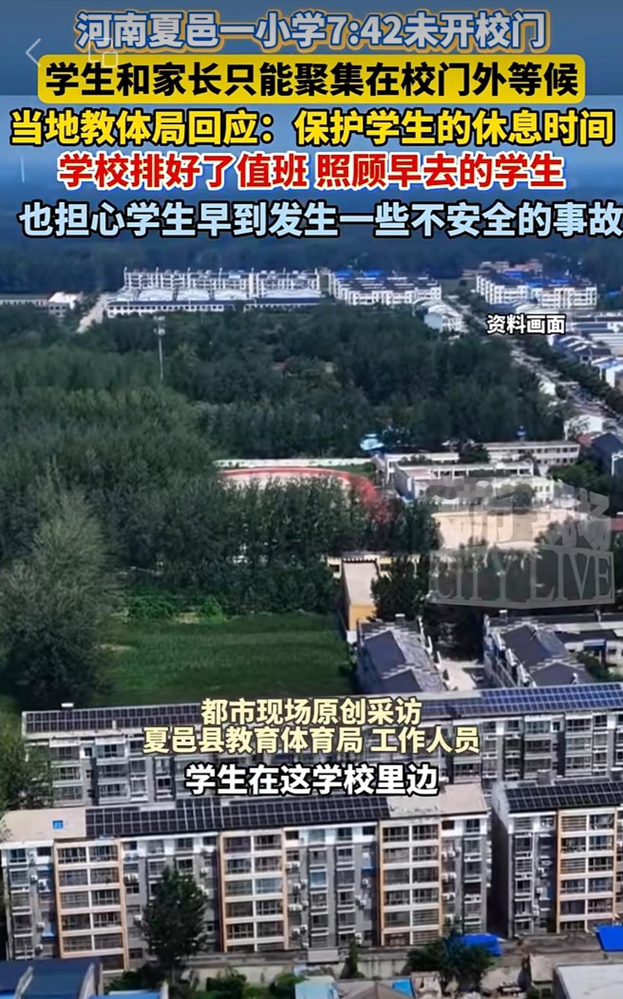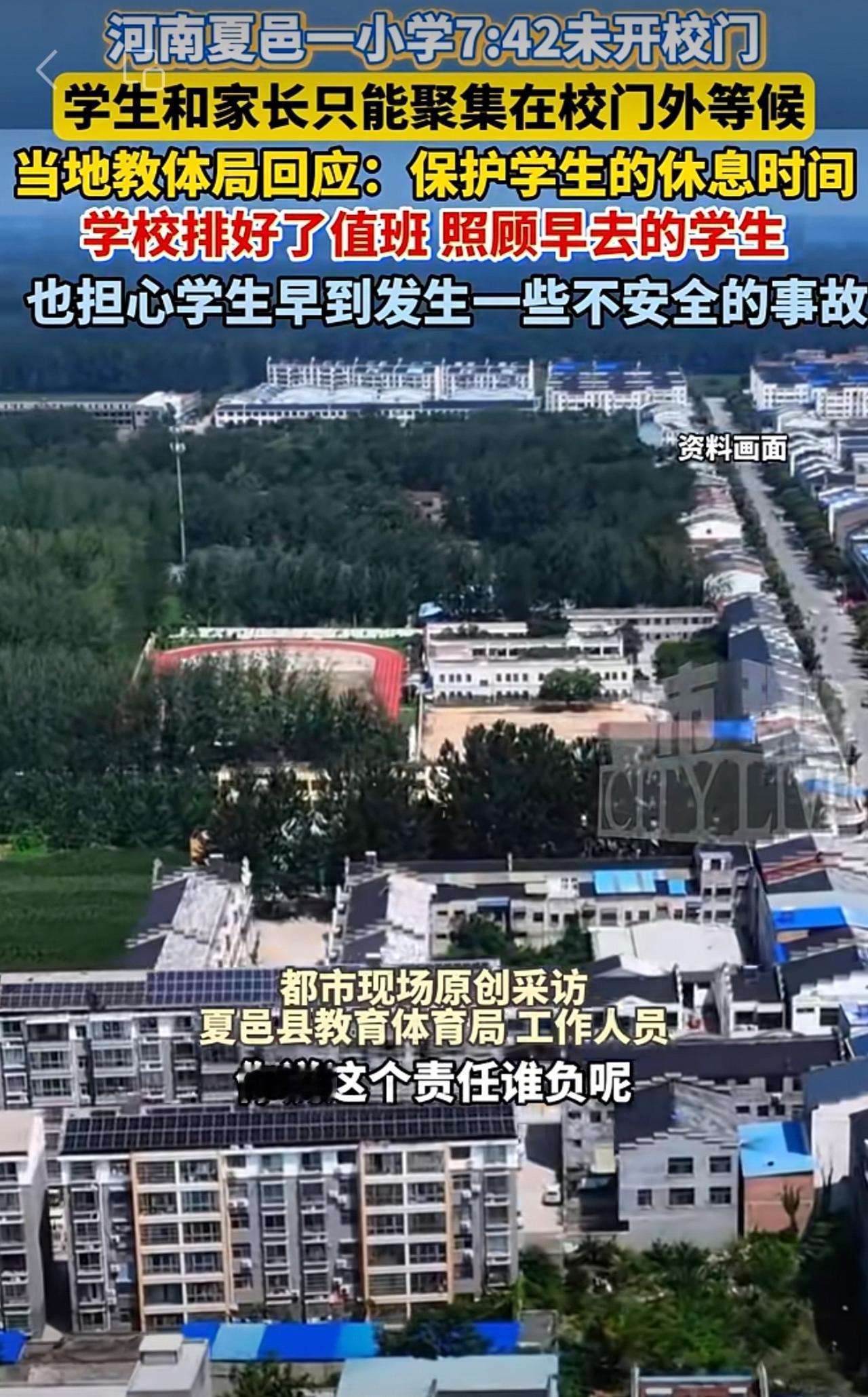 河南夏邑一小学7:42未开校门,学生和家长只能聚集在校门外等候。当地教体局回应: