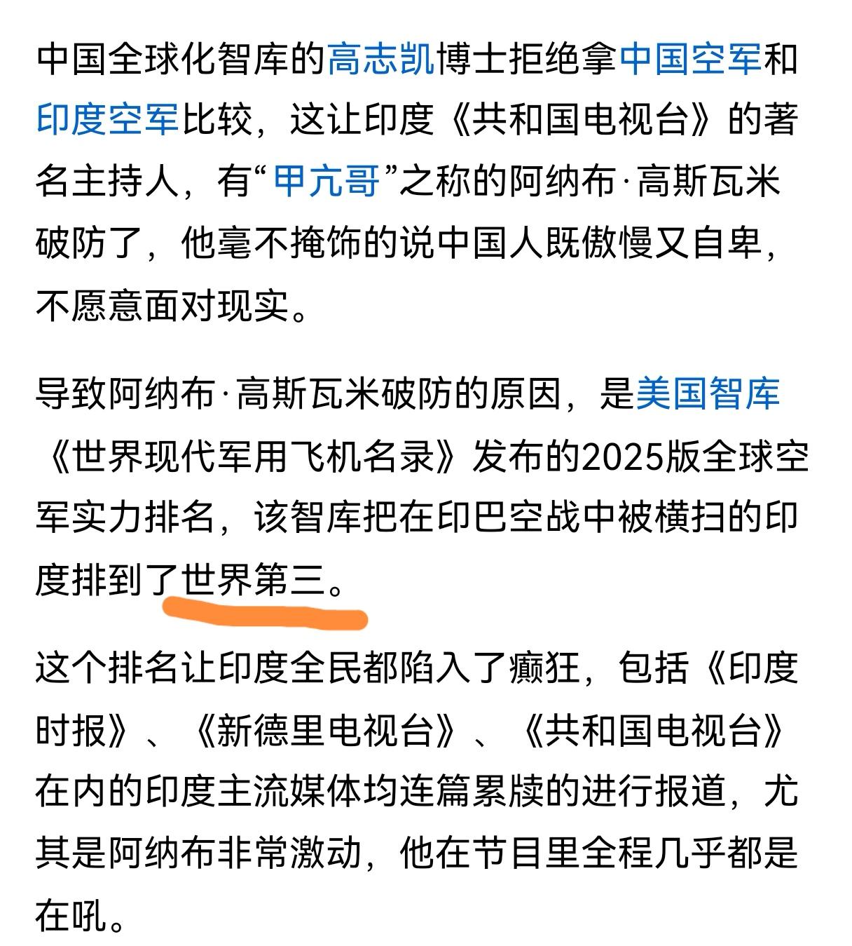 印度阿三,果然喜欢做小三 自从印巴空战后,印度似乎被人捏住了命门,不知道天高地厚了。这不,别人说它的空军世界第三,它马上就抖擞起来,说自己排名第三,完全忘记了被巴基斯坦揍得鼻青脸肿。 其实印度可以拿世界人口第一、恒河水是圣水、咖喱是世界最好的食物来炫耀的,完全没必要以军力世界第三自豪。毕竟过几年,说不定印度还能成世界第一军事强国,到那时再吹也不迟。