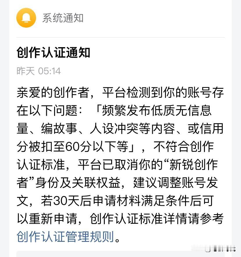 来头条已有600多天了,离总收益10万还差几千,正为凑整而焦虑不已,谁知头条给了我这一个决定瞬间让我释然。 近期收益骤降,每天收益小三位数都很稀缺,有时甚至个位数都出现。两个月之前收益还不错,日赚千元、大三位数也常见,最高的一篇收益也有4000多。 每天绞尽脑汁,辛苦码字,看到收益一览的数据不是滋味。原本打算在月底达到目标,却是越来越远。心情也随着这收益跌入谷底。 幸好头条发来一条信息,仔细一看,头条新锐创作者称号被摘除了,要一个月后再申请。我并没有失望,反而突然释然。 这600多天以来,日更二三篇,从未间断。这下我终于任性一把,不要每天无时无刻沉浸在电脑中,彻底放松自己。 终于可以尽情地买想吃的、买想穿的,到处走走逛逛,不再为收益烦恼了。 近期写头条又累又不赚钱,付出与收益相差太大了。 有些人写着写着就断更了,似乎是写到一半突然被生活按住了头。 随心所欲吧!想写就写,不想写就歇歇!