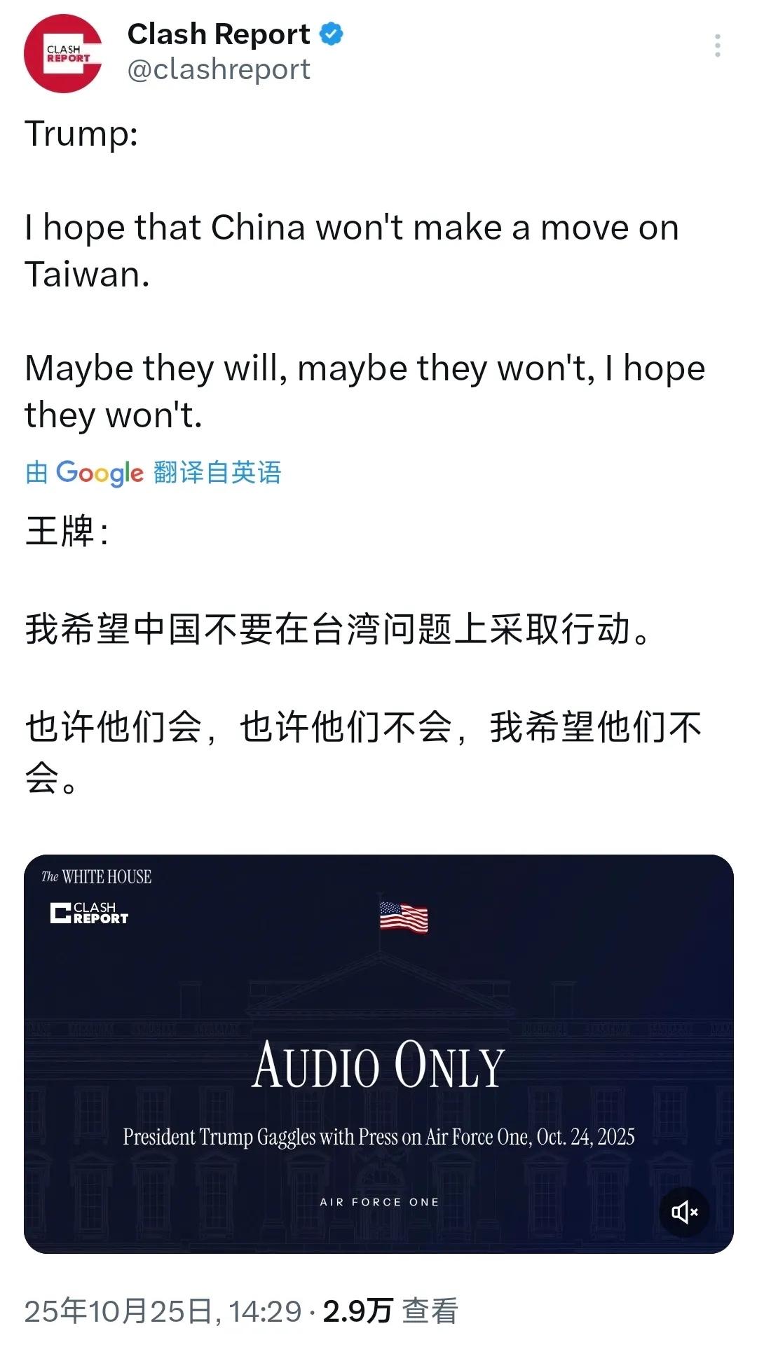 特朗普:“我希望中国不要在台湾问题上采取行动。也许他们会,也许他们不会,我希望他