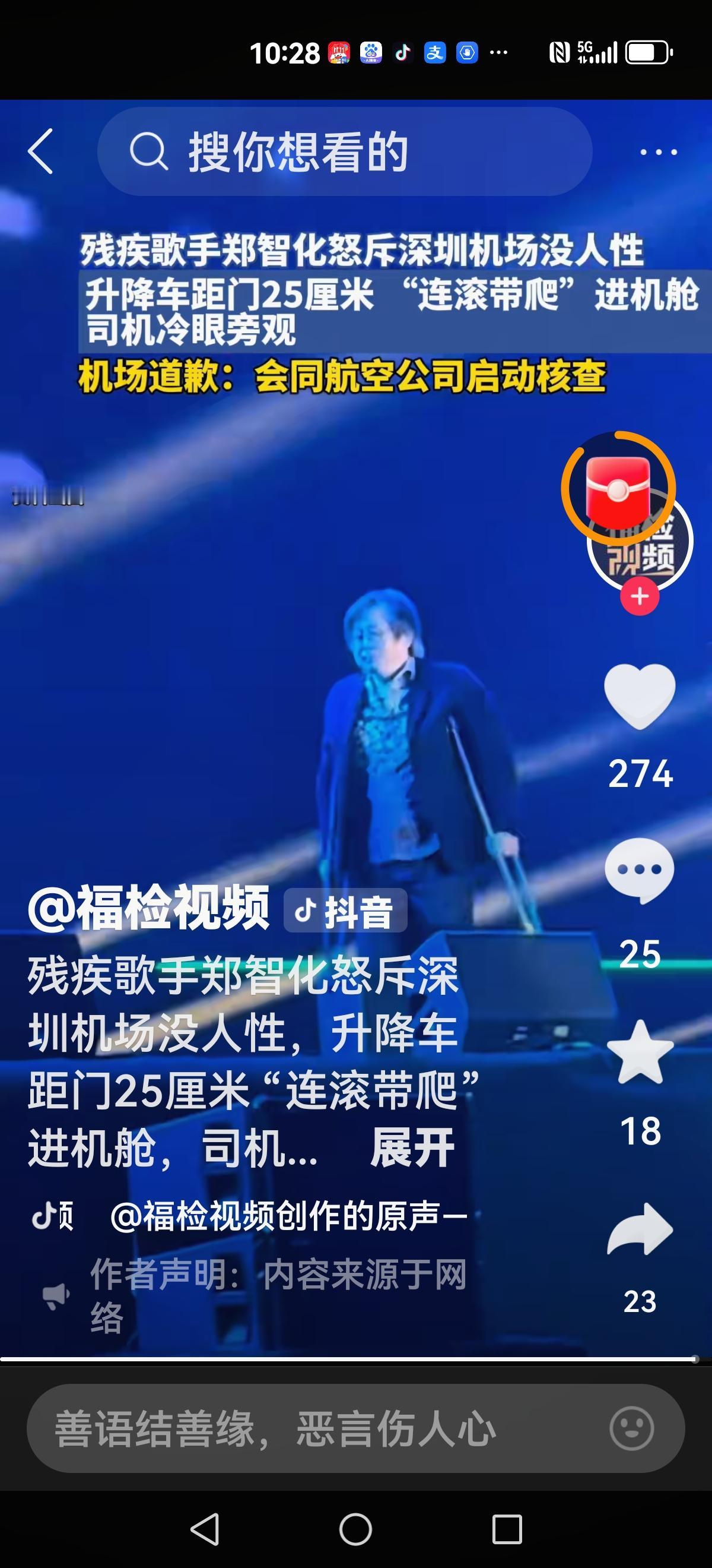 【郑智化:连滚带爬】 这次郑智化吐槽了,平台与飞机舱门这短短距离,让残疾人连滚带爬。 没有人性。 25厘米的距离,竟然没有人帮助,这就是现实,也许从这一刻起,机场会彻底改变,但如果郑智化不是名人那会引发重视吗? 有时看到日本地铁,下车时,有人铺好垫子就是为残疾人的车子方便下车。 无论GDP有多厉害,科技军事有多强,最终目的是让老百姓生活更幸福,更人性化。