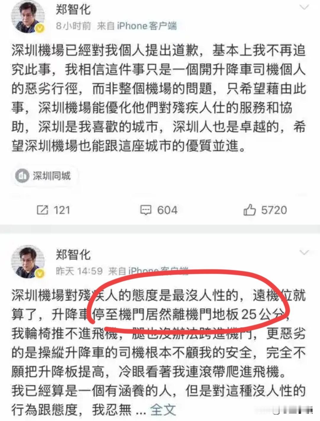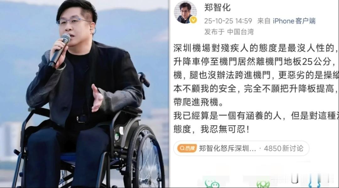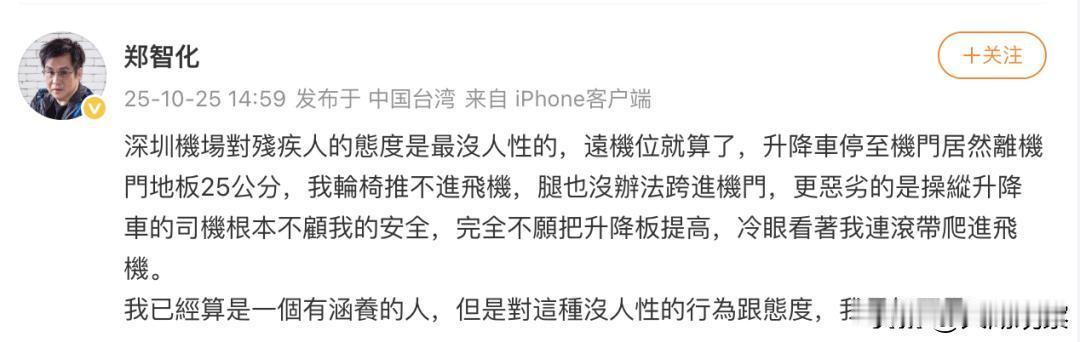 这事儿看得人又气又揪心!台湾歌手郑智化坐轮椅登机,轮椅卡在25厘米缝隙,不仅没有人上前帮忙,司机还在旁边冷眼看着,郑智化怒斥:“深圳机场没人性,看我连滚带爬进飞机! ”随后,深圳机场深夜道歉,解释说是按安全规范得留20厘米防刮碰!可这事儿真就这么简单?20厘米的安全距离,就没提前想到会卡轮椅?这到底是司机个人失职,还是机场无障碍服务本就有漏洞呢?我们一起来看! 综合红星新闻等媒体报道,10月25号晚,郑智化乘深航航班从深圳飞台北,因航班停在了远机位,机场用登机车保障。机场说根据安全规范,登机车得和机舱留20厘米高度差防刮碰,可这"规范"却把轮椅旅客卡得死死的,轮椅推不上去,而操纵升降车的司机不愿把升降板提高,冷眼看着郑智化被困在原地。 最后他靠着2名工作人员的帮忙才勉强登机。随后,机场致歉,承诺优先给轮椅旅客安排廊桥、保障人员从1人增到2人,还试点新的连接装置补高度差! 说实话,“安全规范”不该是“服务缺位”的借口!郑智化回应说“司机个人恶劣行径”,可反过来想:如果保障流程早点考虑到轮椅旅客的需求,比如提前备好连接装置,或者司机有主动协助的意识,哪会让旅客陷入“连滚带爬”的窘境? 网友们的评论一针见血:“规范是死的人是活的,20厘米的安全距离,就不能用设备或人力补上这差距吗?”还有人吐槽:“平时喊着无障碍,真到关键时刻,还是让残障人士为难!” 不过,深圳机场的整改速度值得肯定,从优先廊桥到增派人员,再到试点新装置,没回避问题而是“立行立改”。郑智化也只盼优化服务,这份体谅更让人看清:大家在意的不是“追责”,而是希望残疾旅客能真正“无障碍”出行。 值得一提的是,现在很多地方的无障碍设施,要么“形同虚设”,要么“流程脱节”。比如有的车站轮椅坡道太陡,有的商场无障碍电梯锁着。通过这件事,给所有公共场所提了个醒:无障碍服务不能只停在嘴上、贴在墙上,得落到每一个细节里。 希望深圳机场的整改不是"一阵风",也希望更多地方能跟着学习,别再让残疾旅客因为"25厘米的缝隙"、"锁着的电梯"、"找不到的通道"为难!