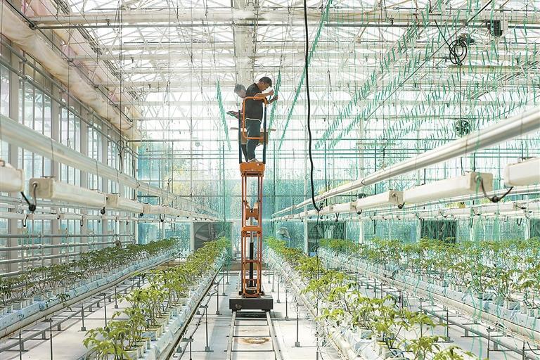 ◀图为在农业农村部规划设计研究院设施农业研究所永清精准实验基地内,工作人员为新栽种的西红柿绕蔓。本报记者王静本报通讯员庞趁友摄