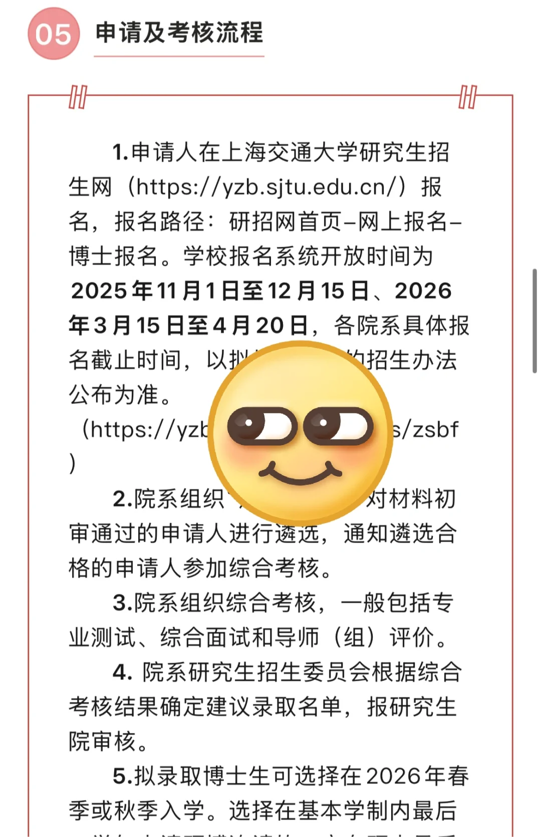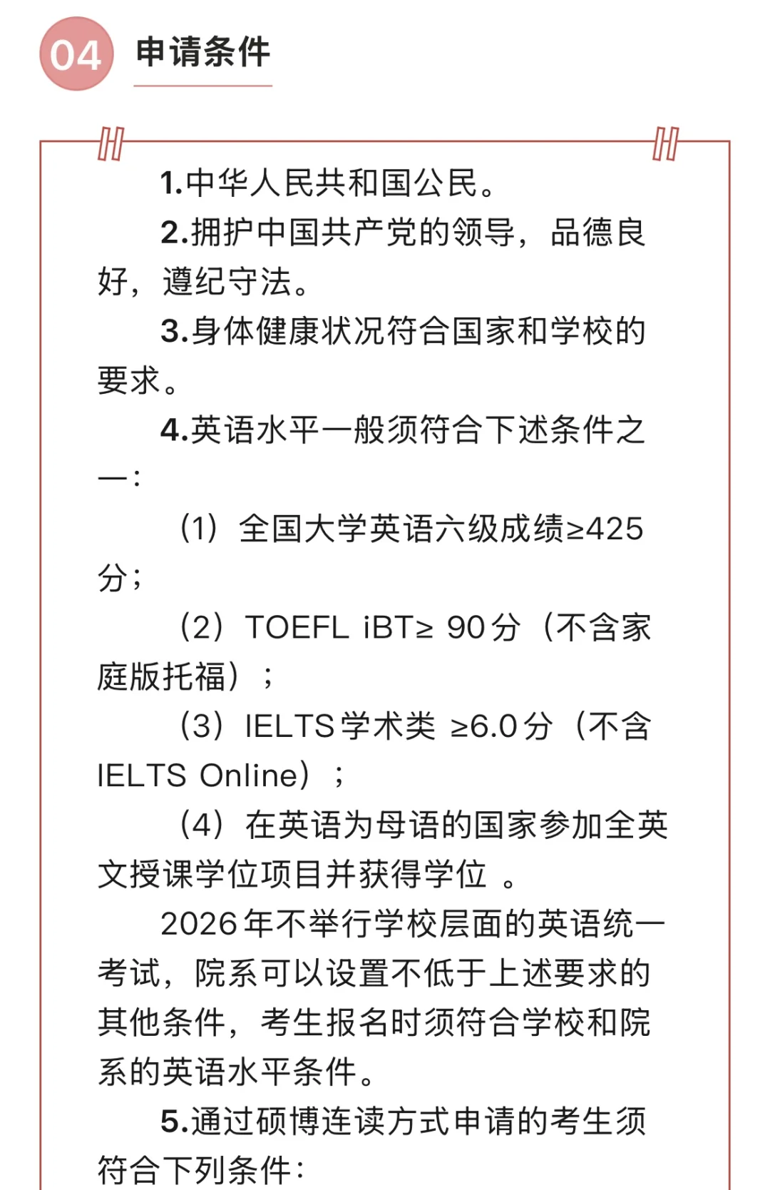 招生规模 2026年博士研究生计划招生规模5000名左右,其中校本部招生规模4000名左右。学校将根据学科建设需求和生源情况适当调整,最终招生规模以教育部正式下达的招生计划为准。02 学习形式和学习年限 博士研究生的学习形式分为全日制和非全日制。学术学位博士研究生的学习形式一般为全日制(少量专项计划除外),专业学位博士研究生的学习形式包括全日制和非全日制。非全日制专业学位博士的招生简章另行发布。直博生的基本学习年限为5年,其他博士生的基本学习年限为4年。03选拔方式 1.本科直博。国内应届本科毕业生申请直博,申请条件、申请材料、申请办法等与推免生相同,详见上海交通大学2026年招收优秀应届本科毕业生免试攻读研究生(含直博)办法。2.硕博连读。面向已按学科培养方案要求修完全部硕士学位课程、各科成绩优秀,经导师同意可申请硕博连读的本校二年级、三年级非定向就业在读优秀硕士研究生。3.申请-考核。面向已获硕士或博士学位人员,应届硕士毕业生最迟须在录取当年入学前取得国家承认的硕士毕业证书和硕士学位证书或教育部留学服务中心出具的《国(境)外学历学位认证书》。04申请条件 1.中华人民共和国公民。2.拥护中国共产党的领导,品德良好,遵纪守法。3.身体健康状况符合国家和学校的要求。4.英语水平一般须符合下述条件之一:(1)全国大学英语六级成绩≥425分; (2)TOEFL iBT≥ 90分(不含家庭版托福); (3)IELTS学术类 ≥6.0分(不含IELTS Online);(4)在英语为母语的国家参加全英文授课学位项目并获得学位 。