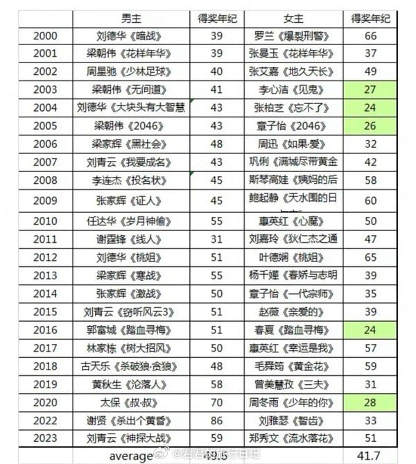 图2是金像奖影帝影后的获奖年纪,影后平均年龄40岁以上,影帝50多岁(表格只统计到23年)。所以,金像奖也一直被诟病太敬老,打压新秀。