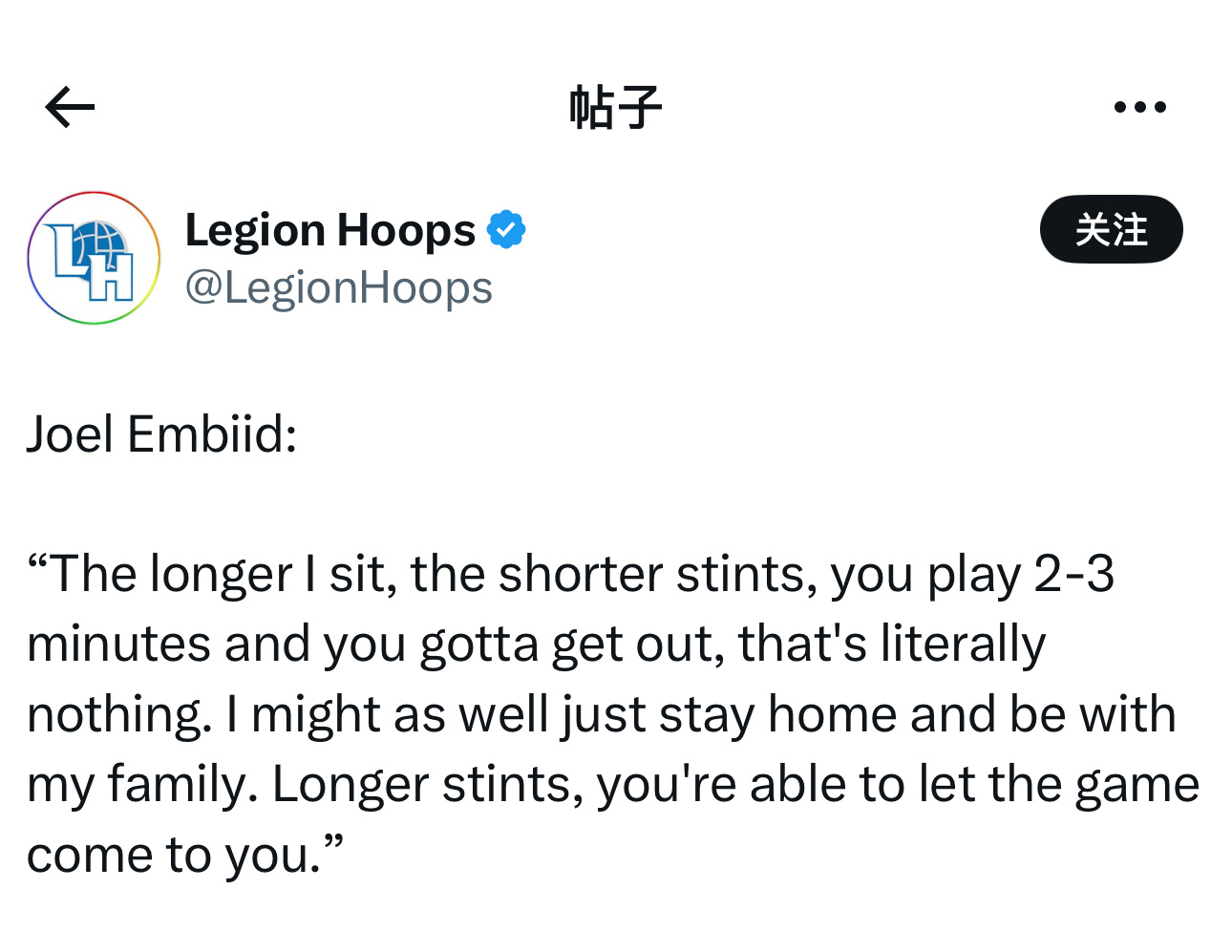 乔尔·恩比德赛后采访时,谈及自己受上场时间限制[围观]