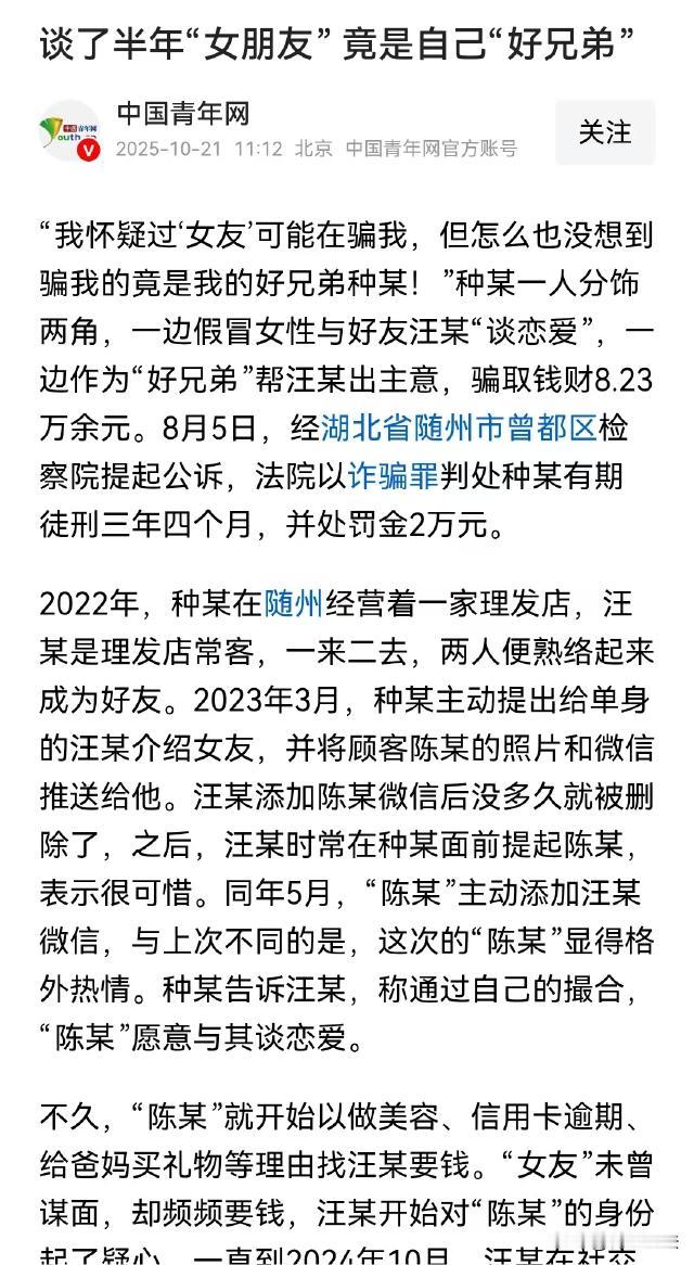 女友竟是好兄弟!湖北随州的汪先生经常去种某的理发店剪头发,一来二去和种某成了好兄弟,一年后种某将女顾客陈某介绍给了汪先生,汪先生和陈某发展成了男女朋友关系。汪先生先后转给陈某8万多元,却渐渐察觉情况不对。汪先生找到陈某的社交账号留言,这才发现和自己恋爱的陈某别人假冒的。 据中国青年网等报道,种某是一位理发师,自己开了一家理发店,汪先生是种某店里的常客。 去的次数多了,汪先生和种某成了好哥们,二人无话不谈。 23年3月的一天,一次交谈中,汪先生说自己还没女朋友。种某接话说,他有个女顾客陈某,长得非常漂亮,性格也好,和汪先生非常般配,随后种某就将陈某的联系方式推给了汪先生。 汪先生加上了陈某,对她嘘寒问暖,可是陈某对他不冷不热,没过几天就将汪先生删了。 汪先生对陈某印象非常好,此后多次在种某面前唉声叹气,说没能和陈某更进一步太可惜了。 种某说,他给汪先生说说好话,看陈某能不能再给汪先生一次机会。 同年5月,陈某突然主动加了汪先生的联系方式,这次她像变了一个人一样,对汪先生非常主动。 汪先生高兴坏了,种某也告诉他说,经过自己的撮合,陈某愿意和汪先生谈恋爱。 就这样,汪先生和陈某谈起了恋爱,恋爱没多久,陈某就找各种理由找汪先生要钱,不是说要去做美容,就是说信用卡到期了。 汪先生最开始都痛快给了,可是次数一多,他也不由产生了怀疑,他和陈某虽然一直聊天,但还没在现实中见过面。 汪先生留了个心眼,陈某再要钱时,他也找借口不给。自从汪先生不给钱后,陈某就不理他了。 汪先生确定陈某就是奔着他的钱来的,两个人刚谈了半年就分手了,陈某也将汪先生的联系方式拉黑了。 可是这半年来,汪先生前前后后已经给陈某花了82300多元。 24年10月,汪先生找到了陈某的社交账号,于是给陈某留言让她还钱。 陈某非常疑惑,和汪先生对质,两人这才发现,那个和汪先生谈恋爱的根本不是陈某本人,而是种某冒充的。 今年1月汪先生报了警,种某被抓捕归案后说,他这么干是因为当时要开一家新理发店,手里钱不够,这才注册了一个小号,想从汪先生那里弄点钱花花。 1、种某的行为明显构成诈骗罪。 诈骗罪是指以非法占有为目的,用虚构事实或者隐瞒真相的方法,骗取数额较大的公私财物的行为。 种某以非法占有为目的,通过注册小号冒充陈某与汪先生建立恋爱关系,然后编造各种理由向汪先生索要钱财。 在整个过程中,种某故意虚构事实,让汪先生误以为自己是在与真实的陈某谈恋爱,并基于这种错误认识而自愿交付钱财。 汪先生在半年内先后转给种某冒充的陈某82300多元,已达到数额较大的标准,种某的行为完全符合诈骗罪的构成要件。 《刑法》第二百六十六条规定:诈骗公私财物,数额较大的,处三年以下有期徒刑、拘役或者管制,并处或者单处罚金;数额巨大或者有其他严重情节的,处三年以上十年以下有期徒刑,并处罚金;数额特别巨大或者有其他特别严重情节的,处十年以上有期徒刑或者无期徒刑,并处罚金或者没收财产。 种某诈骗汪先生钱财8万多元,已经构成了数额较大的标准,应在3年以上10年以下的刑期内量刑。 如果种某认罪认罚态度良好,积极退赃、积极取得汪先生的谅解,在量刑时会适当较轻处罚。 另外,种某故意隐瞒真实身份,使汪先生在违背真实意愿的情况下进行了财产处分。 根据《民法典》第一百四十八条规定:一方以欺诈手段,使对方在违背真实意思的情况下实施的民事法律行为,受欺诈方有权请求人民法院或者仲裁机构予以撤销。 汪先生有权要求撤销与种某冒充的陈某之间涉及财产处分的民事法律行为,并要求种某返还被骗取的钱财。 2、种某侵犯了陈某的姓名权。 《民法典》第一千零一十四条规定:任何组织或者个人不得以干涉、盗用、假冒等方式侵害他人的姓名权或者名称权。 种某未经陈某同意,擅自使用陈某的名义与汪先生交往并实施诈骗行为,属于典型的假冒他人姓名的侵权行为。 如果陈某追究,种某需要承担侵权责任,向陈某赔礼道歉,消除因假冒行为给陈某带来的不良影响。
