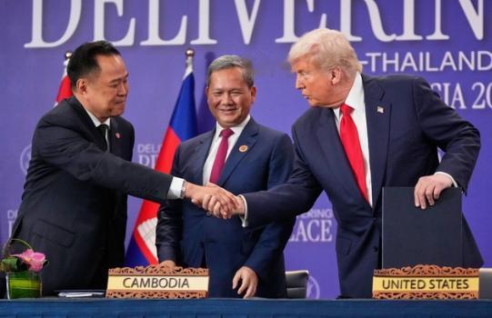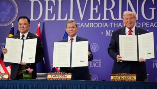 特朗普的功劳?他又见证一起国际和平协议的签署 在亚洲之行的首站马来西亚,美国总统特朗普见证了泰国和柬埔寨之间签署的停火协议。参加签字仪式的领导人是泰国新任总理阿努廷·查伦比拉克、柬埔寨首相洪马内,特朗普以及马来西亚总理安瓦尔·易卜拉欣作为见证人共同出席。 这场停火协议是在双方发生流血边境冲突后签署的。今年七月,泰柬边境爆发小规模冲突,共造成逾40人死亡,约30万人被迫逃离家园。 柬埔寨外交部声明称,根据协议,将有18名柬埔寨战俘获释。