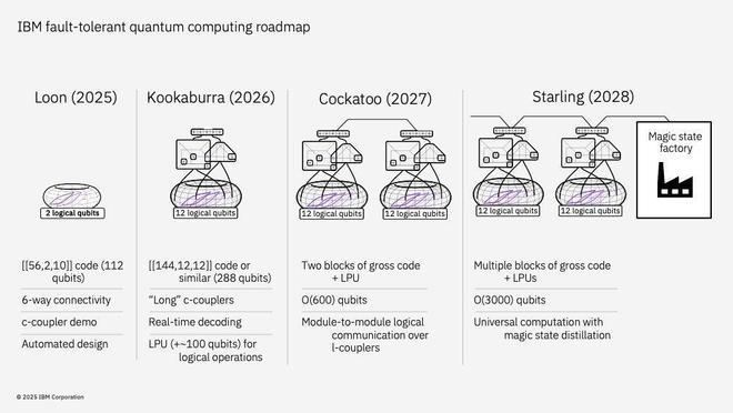 当时,IBM的路线图里清晰地描绘了在2028年交付代号为“Starling”(椋鸟)的大规模容错量子计算机的目标,该系统预计能利用200个逻辑量子位执行一亿次量子操作。