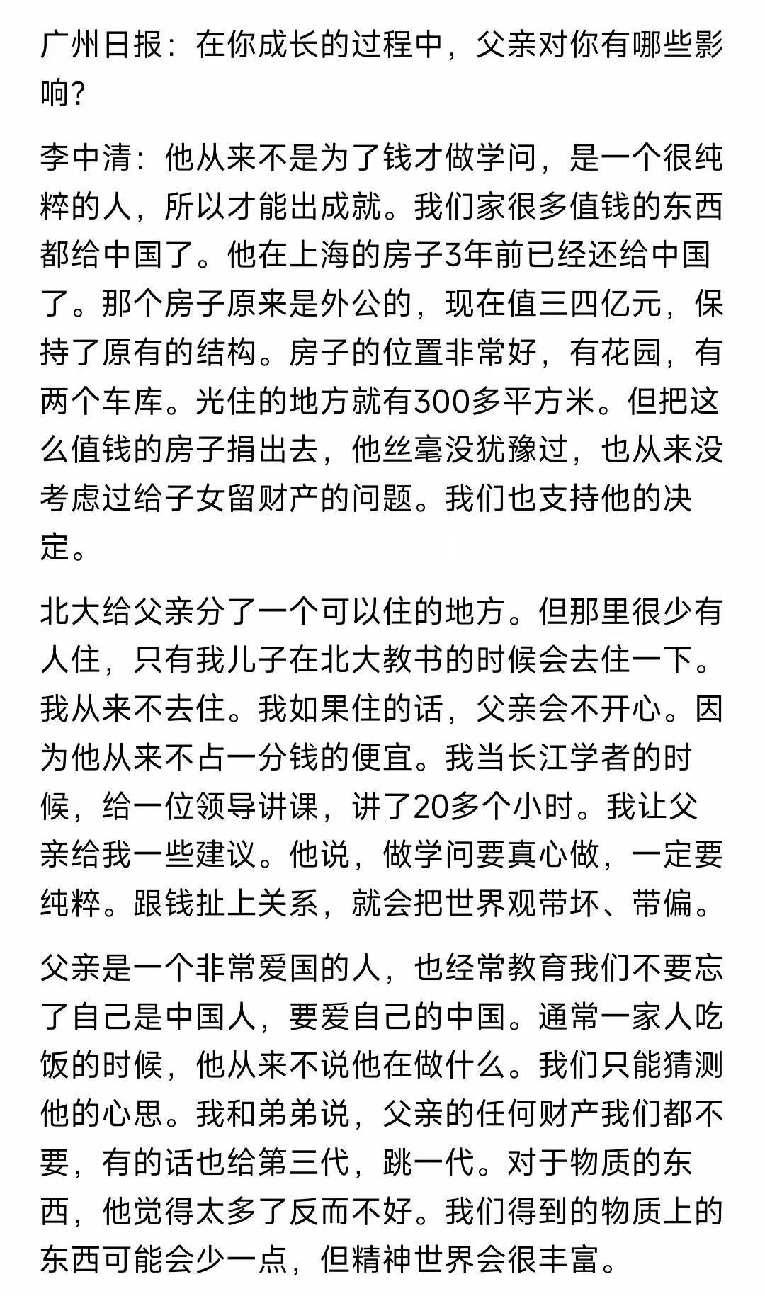 李政道对钱真的没啥概念一样,上海有一套别墅,据李中清说价值三四亿,李政道说捐就捐了。李政道总说做学问不要追求名气,不要追求利益,就是纯粹的做学问,不少人可能觉得这是场面话。而李中清曾经接受广州日报的采访,是很明确的说,爸爸不留遗产给子女的。 甚至于说李政道把在上海的豪宅,那里的豪宅原来也不是李政道的,是秦惠莙爸爸给的,当时的价值就有三四个亿,李政道也是不要就不要,直接捐了,据说捐给了上海交通大学。这样的大手笔,对一个科学家来说,也是罕见的。 在物质上,李政道是真的超级无所谓的。 “三四亿?那是多少钱?”要是当面问李政道,他大概会眨眨眼,把话题拐到μ子衰变或者费米子质量上去。对老爷子而言,钱就像空气——必不可少,却用不着成天数着分子量过日子。儿子李中清早就习惯:老爸钱包里常年躺着一张皱巴巴的百元钞,边角卷成毛边,跟实验室砂纸差不多;刷完学术会议餐费,余额多少他从不查,银行卡密码干脆写在卡背面,省得自己记不住。旁人听着捏汗,他倒自在:卡丢了再办,时间浪费在记数字上才不划算。 提起上海那套顶级豪宅,圈内人津津乐道的不是“捐了”,而是“说捐就捐”。房子位于老法租界核心,红砖立面带花园,面积大到能停下一辆小型巴士,市值一度冲到四亿。可李政道只记得两件事:一是推窗能见梧桐叶,阳光碎金般洒在书桌上,适合推导公式;二是楼梯太陡,夫人秦惠莙上下不方便。至于“四亿”是多少个零,他压根没算过——“够买几台对撞机?”他一句话把中介噎到原地石化。后来交大筹建李政道研究所,老爷子听完汇报,当场拍板:“房子给你们,拿去做青年公寓,让娃娃们睡得离实验室近一点。”秘书提醒“市价好几亿”,他挥手打断:“哦,那就省点装修钱,别把科研经费用在买沙发上。” 这种“超级无所谓”贯穿了他整个生活。手表是三十年前的老“上海”,玻璃表面划得跟毛玻璃似的;领带只有两条,轮换着系,颜色褪到分辨不出原本花纹。参加国际会议,主办方安排五星套房,他转身换成普通标间,理由令人哭笑不得:“大床太软,一躺下就睡着,耽误想问题。”儿子想给他换辆SUV,他摇头:“车能开就行,排气量小一点,二氧化碳少一点,对地球好一点。”李中清只好把买车的钱投进家族公益基金,老爷子听完点点头:“这就对了,钱要拿来买知识,不是买铁皮。” 有人质疑:“不留遗产给子女,是不是太苛刻?”李中清却笑说:“父亲把最值钱的东西早就给了我们——好奇心、批判思维、对世界的敬畏。”至于现金房产,老爷子逻辑直白:留给子女,他们可能为分钱打得头破血流;捐给高校,却能变成实验室里的一束激光、显微镜下的一张原子相,让更多年轻人摸到科学的边。事实证明,这套理念比任何遗嘱都管用:李政道研究所拔地而起,全球顶尖物理学家纷至沓来;CUSPEA项目(中美联合招考物理研究生)资助的上千名学子,如今遍布世界各大实验室,不少人已成长为领域里的领军人物。老爷子眯眼笑:“看,这就是复利,比银行利息高得多。” 我曾在交大听过他一场讲座,主题是“科学与人生”。演讲结束,有学生站起来问:“李老师,您怎样看待财富自由?”老先生推了推眼镜,反问:“什么叫财富自由?你的大脑自由了吗?如果你的思想总被金钱牵着走,那才叫真正的贫穷。”全场安静三秒,随即掌声雷动。那一刻,我突然明白:所谓“对钱没概念”,并不是不知钱为何物,而是把钱的优先级调到最低——让空气回归空气,让理想回归理想。豪宅、名表、豪车,于他都是尘埃,只有方程式和黑板上飞扬的粉笔屑,才值得驻足。 当然,这种境界普通人学不来,也无需硬学。我们朝九晚五,为房贷车贷奔波,为孩子的奶粉钱计较,这是生活本色。但李政道至少提醒我们:钱可以赚,也可以花,更可以放手——当它能为更多人点亮一盏灯时,别吝啬。哪怕我们捐不出几亿豪宅,把旧书捐给山区学校、把不再穿的冬衣放进社区公益箱,也是在给世界升温。老爷子把巨款推向科研,我们把手头的小资源推向需要的人,本质上是一样的:让价值流动,让知识、温暖、希望代代相传。 回到开头那套别墅,如今已是李政道研究所的青年公寓。夜晚灯火通明,博士生们端着咖啡穿梭,讨论暗物质、量子计算、引力波。他们或许不知道,自己脚下的地板曾价值数亿;但一定知道,头顶那片星空,有人替他们预付了门票。想到这里,我不禁想起老爷子的一句话:“做学问要像剥洋葱,一层层剥开,剥到最后一无所有,却让你泪流满面。”对财富,他亦是如此——剥掉名、剥掉利,剩下纯粹的求知欲,像洋葱芯一样洁白、辛辣、令人流泪,也让人清醒。 各位读者你们怎么看?欢迎在评论区讨论。