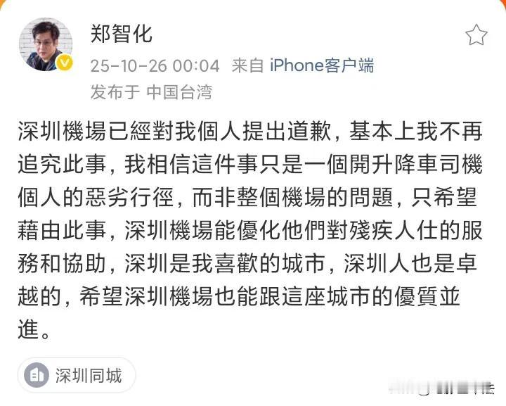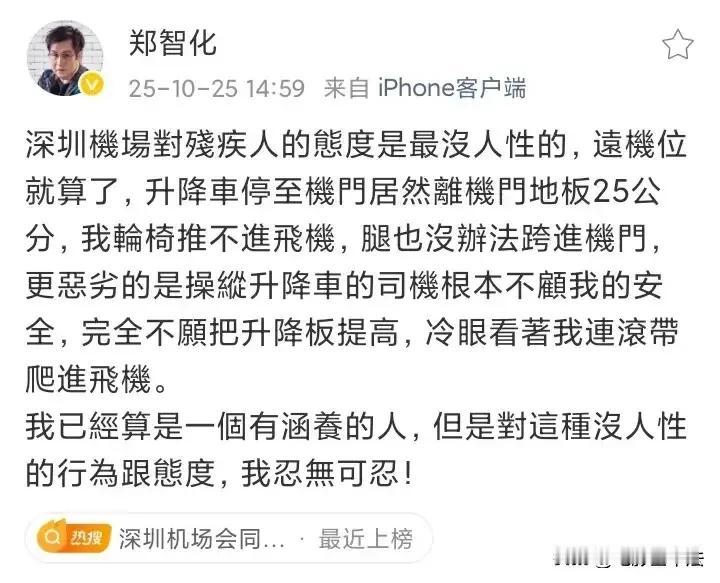 郑智化,你应该向全国人民道歉! 他又发文了,说自己在大陆经常被各地机场刁难和苛刻,这种把旅客当罪犯的行为举世罕见,尤其是深圳机场的升降车,不是帮你上飞机,而是刁难你上不了飞机。 他说他去过的其他地方的机场都没有这种问题,只有大陆机场有。 他还质疑大陆机场的安检不是严苛,而是刁难,把旅客当罪犯! 他说他是个音乐人,热爱到处去演唱,但是因为大陆机场对他的恶意刁难,让他有了隐退念头。 首先不是只有郑智化一个人坐过飞机,每个机场都踩雷的几率几乎是0,如果你觉得每个机场都有问题,那大概率是你自己的问题。 他说的刁难真的是刁难吗?安检严苛都是有原因的,是对乘客生命安全负责的表现! 其次隐退不隐退是郑智化的自由,但是隐退之前,最好还是解释一下为什么之前的发声和深圳机场的监控视频有很大出入,明明有4个工作人员全力配合,怎么成了“冷眼旁观、毫无人性”?明明几个工作人员搀着进飞机的,怎么“连滚带爬”了? 第一次看见有艺人被证明言论与事实有出入之后,不是忙着还原真相证明自己清白,而是发文转移视线把问题扩大并“郑智”化的,不愧叫郑智化!