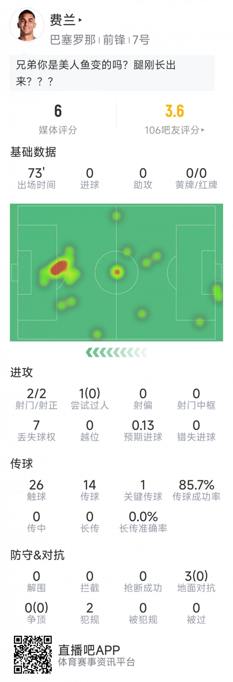 费兰本场数据:2次射门均射正,1次关键传球,3次对抗0成功