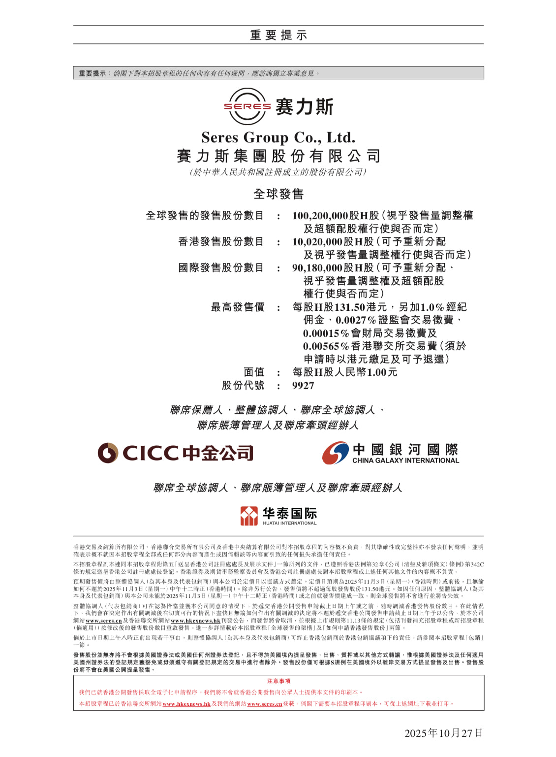 上证报中国证券网讯(记者俞立严)10月27日,赛力斯开启港股招股,招股期持续至10月31日,计划于11月5日正式以“9927”为股票代码在港交所主板挂牌,上市后将成为首家“A+H”两地上市的豪华新能源车企。