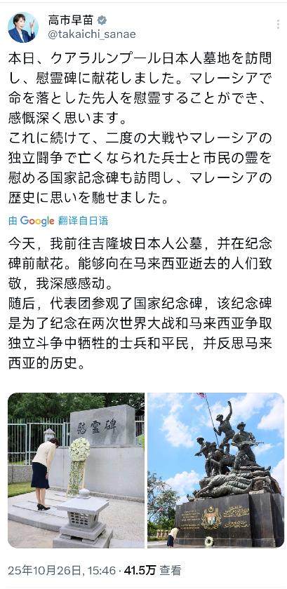日本新任首相高市早苗10月26日发文写道:“今天,我前往吉隆坡日本人公墓,并在纪念碑前献花。能够向在马来西亚逝去的人们致敬,我深感感动。 随后,代表团参观了国家纪念碑,该纪念碑是为了纪念在两次世界大战和马来西亚争取独立斗争中牺牲的士兵和平民,并反思马来西亚的历史。” 高市早苗这人可不是什么温和派。她长期坚持参拜靖国神社,那里头供奉着二战甲级战犯。她甚至把日本当年的侵略行为说成是“自卫战争”,对“村山谈话”里的“侵略”一词也唧唧歪歪。就在今年8月15日,她还作为前经济安全保障担当大臣跑去靖国神社拜鬼。这么一个人突然在马来西亚表现得如此“热爱和平”,难免让人怀疑是在作秀。 她去的那个吉隆坡日本人公墓,里头埋的主要是二战结束后滞留在马来西亚的日本平民和军人。高市早苗特意跑去献花,强调“向在马来西亚逝去的人们致敬”,却绝口不提日本侵略军给马来西亚人带来的灾难。这波操作选择性太强,明显是在避重就轻。 更值得玩味的是她还参观了马来西亚国家纪念碑。这个纪念碑是为了纪念在两次世界大战和马来西亚独立斗争中牺牲的人。马来西亚在二战期间被日本占领了三年八个月,那段时间几十万马来西亚人遇难,其中很多是当地华人。日本侵略者在当地干尽了坏事,这段历史马来西亚人记得清清楚楚。 就在2018年,马来西亚华人社团还在吉隆坡建了和平公园,特设30.8米高的“马来亚二战人民蒙难纪念总碑”,就是要把日本占领3年8个月这段历史钉在耻辱柱上。公园里种了茅草、橡胶树这些日据时期常见的植物,就是要让大家不忘过去。 高市早苗说要“反思马来西亚的历史”,但她真敢面对日本在马来西亚的侵略行径吗。马来西亚各地都有抗日纪念碑,每年都有公祭活动。比如吉隆坡福建义山就有日据时期殉难同胞纪念碑,马来西亚福建乡亲每年秋祭都会举办公祭仪式。这些都在提醒人们不要忘记日本军国主义犯下的罪行。 说到历史,不得不提南侨机工。抗战时期,来自马来西亚等地的3200多名华侨司机和技工冒着生命危险通过滇缅公路向中国输送物资。一千多人牺牲在路上,滇缅公路平均每公里就牺牲一位机工。马来西亚各地都有纪念他们的纪念碑,比如槟城有“槟榔屿华侨抗战殉职机工罹难同胞纪念碑”,吉隆坡广东义山有“雪兰莪华侨机工回国抗战殉难纪念碑”。高市早苗要真反思历史,这些才应该是重点。 但看高市早苗的实际行动,她的“反思”恐怕只是做做样子。她一上任就急着在东盟会议期间见菲律宾总统小马科斯,明显是想在南海问题上搅局。紧接着她又赶回日本迎接美国总统特朗普,这一连串动作摆明了要配合美国牵制中国。 这种外交策略和她一贯的反华立场一脉相承。她之前就叫嚣要“让中国明白‘侵犯’台湾的‘成本’和‘风险’”,还主导了对华为5G设备的排除,推动日本对华技术“脱钩”。现在跑马来西亚谈“反思历史”,更像是为她强硬的外交政策披上一层虚伪的外衣。 马来西亚人对日本的态度其实很复杂。虽然两国现在有经济合作,但历史伤痕依然存在。2014年有报道提到,1977年马航MH653空难事件,调查曾怀疑是日本赤军策划的劫机造成的,虽然最终没有确凿证据,但这类事件也反映了历史阴影的残留。高市早苗若以为简单的献花就能掩盖历史问题,那也太小看马来西亚人的历史记忆了。 真正值得警惕的是,高市早苗这类日本右翼政客正试图改写历史。他们不去深刻反省侵略战争,反而通过各种暧昧的举动模糊历史是非。这种看似“温和”的姿态,其实比明目张胆的否认更具欺骗性。 马来西亚民间对日本侵略的历史记忆深刻,不会因为一次政治作秀就轻易改变。高市早苗这场“献花外交”的实际效果,恐怕会适得其反,不仅无法改善日本与马来西亚的关系,反而会让更多人看清日本右翼在历史问题上的真实态度。 历史是最好的教科书。日本要想真正与亚洲邻国和解,就必须像德国那样彻底反省侵略历史,而不是玩这种表面功夫。高市早苗若真有心改善与马来西亚的关系,就该首先正视日本在二战期间的侵略行径,用实际行动取信于亚洲各国人民。 否则,无论她去哪里献花,都难以掩盖日本在历史问题上的巨大欠账。马来西亚人不会忘记历史,亚洲人民也不会忘记。这场精心策划的“献花秀”,最终只会成为高市早苗外交生涯中的又一个污点。