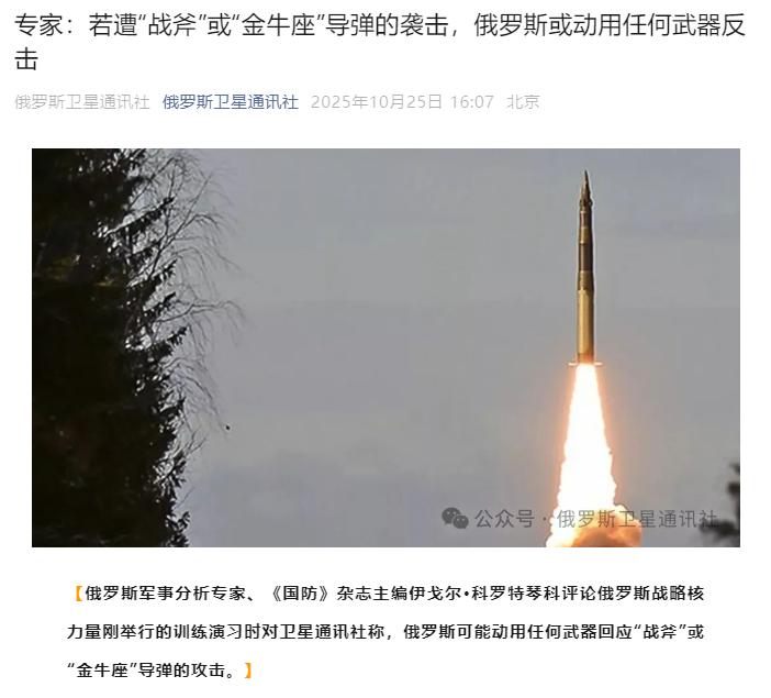 俄最严厉警告:此种情况下可核武打击北约,不提前预告直接动手!   据俄媒10月24日报道,俄军事专家科罗特琴科在接受媒体采访时公开表示,一旦俄罗斯遭到“战斧”或“金牛座”导弹的袭击,俄方将不再局限于常规武器反击,而是会动用包括核武器在内的“任何武器”予以回应。   更关键的是,这种回应的目标不只是冲突中的乌克兰,而是直接指向那些可能提供武器支持的“特定北约国家”。而事件的直接起因,和两款威力不小的导弹密切相关。   “战斧”巡航导弹是美国海军的主力远程打击武器,它的射程能达到2500公里,就像长了眼睛一样,能精准打击远处的固定或移动目标;而“金牛座”导弹则是德国研制的空射巡航导弹,射程也超过500公里,还能穿透坚固的防御工事。   最近一段时间,俄乌冲突一直没停,北约国家对乌克兰的军事援助,从最初的常规武器逐渐转向更先进的装备。德国一直威胁要援助“金牛座”,美国那边也一再表态要送“战斧”。   而俄方一直密切关注着这解动态,尤其担心这两款导弹会被北约国家提供给乌克兰,一旦乌军使用它们攻击俄罗斯本土或者重要的基础设施,比如能源设施、军事基地等,那对俄罗斯的国家安全来说将是严重威胁,这也是俄方此次强硬表态的直接导火索。   从整个事件的经过来看,科罗特琴科的这份声明并不是突然冒出来的,而是俄罗斯一系列战略表态的延续。他长期研究俄罗斯军事政策,他的观点往往能反映出官方立场的重要倾向,所以他的话在国际上也备受关注。   科罗特琴科在声明中明确提到,这次回应会打破以往只针对冲突方的惯例,直接和向乌克兰提供这些导弹的北约国家挂钩,而且特别强调“不提前预告直接动手”,这就意味着一旦触发条件,俄方的反击会来得又快又突然,其严重性不言而喻。   值得注意的是,俄方这次警告特意点出“战斧”和“金牛座”这两个具体的导弹型号,其实是有明确针对性的,就是想遏制北约可能进一步升级对乌武器供应的行为。所以俄方通过划定这样一条“红线”,就是想给北约国家提个醒,不要越过底线继续激化冲突。   而从当前的局势来看,这份警告让本就紧张的俄乌冲突又多了一层变数,北约国家在是否向乌克兰提供这两款导弹的问题上,肯定要面临更复杂的考量,毕竟谁也不想因为武器援助问题直接卷入和俄罗斯的冲突中。   而如何在保持威慑的同时开展对话,找到双方都能接受的平衡点,避免局势朝着更危险的方向发展,已经成为国际社会所有人都在关注的焦点问题。