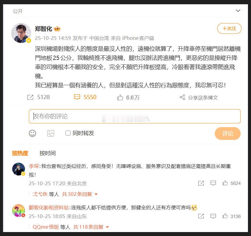 郑智化是25日下午14时40分钟左右(图1),在服务人员帮助下进的飞机机舱,他发微博批评称“没人性”是14时59分(图2),大概是飞机当时还没有起飞,郑先生余怒仍未消[挖鼻][挖鼻]