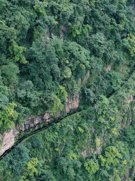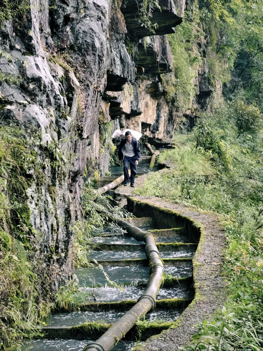 玻璃栈道处能体验到一段崖壁小道的惊险,栈道旁便是出水堰引水渠。1958年始建,在岩壁开凿水渠,可想其中的困难与艰险。(运气好,正好记录到当地人背着货物在崖壁小道上通行。)