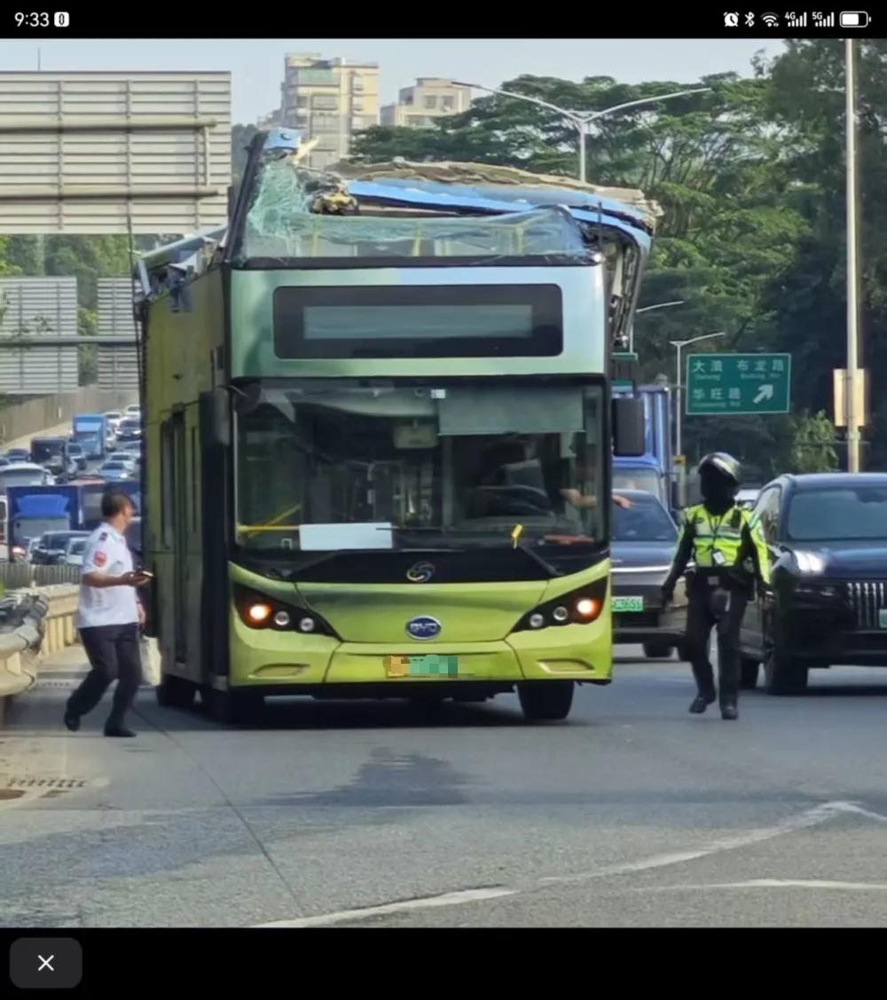 网友发在社交平台的视频显示:深圳龙华区一处高架桥下,一辆双层巴士顶部严重挤压变形,现场玻璃碎片散落一地,周围有不少人站在路边围观。