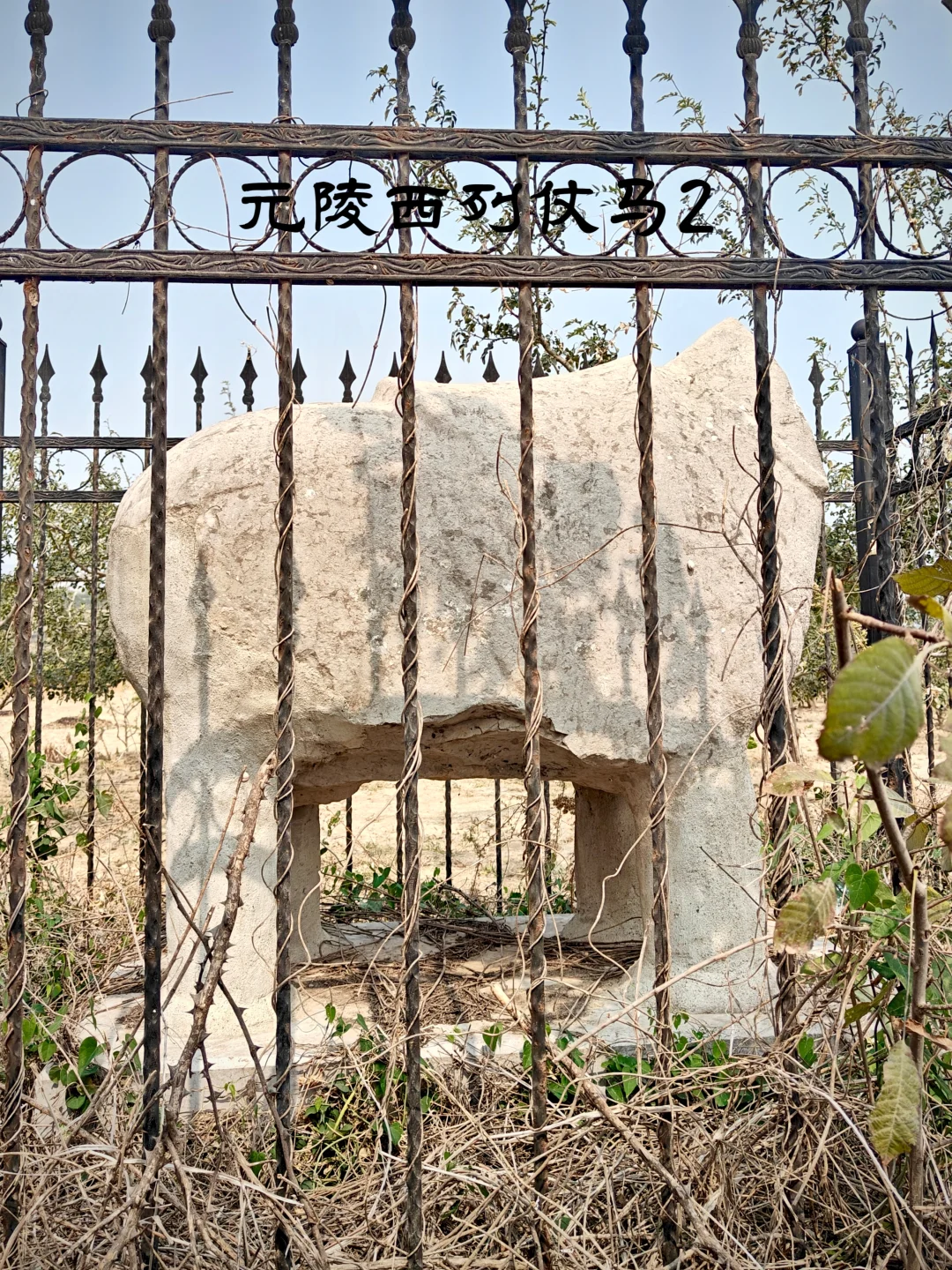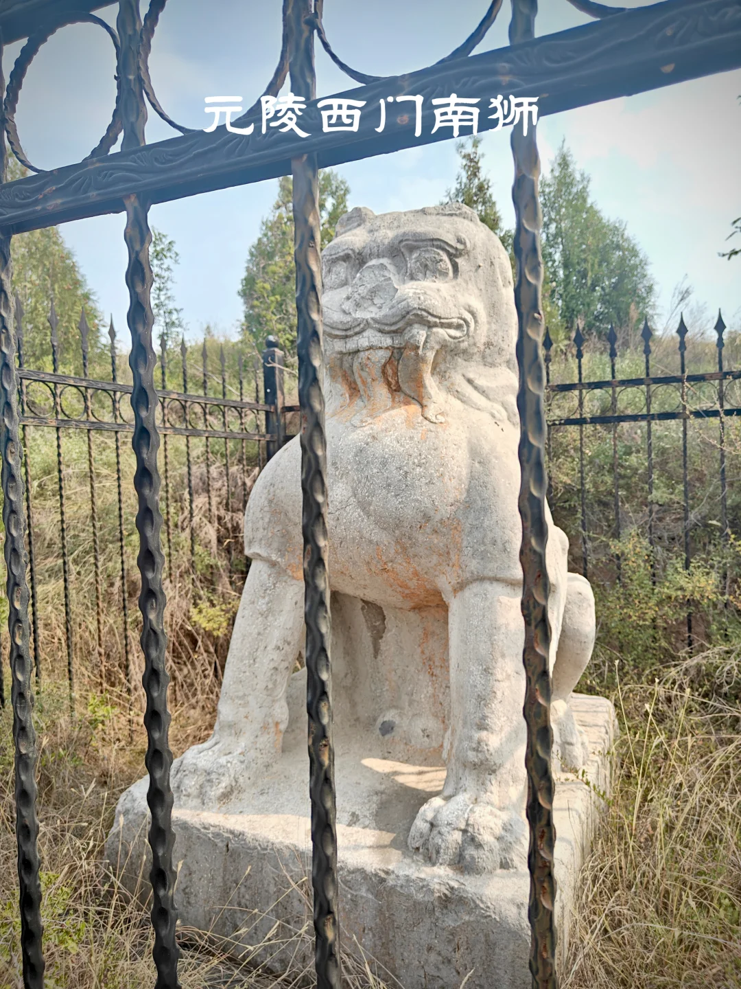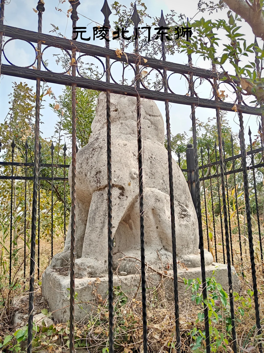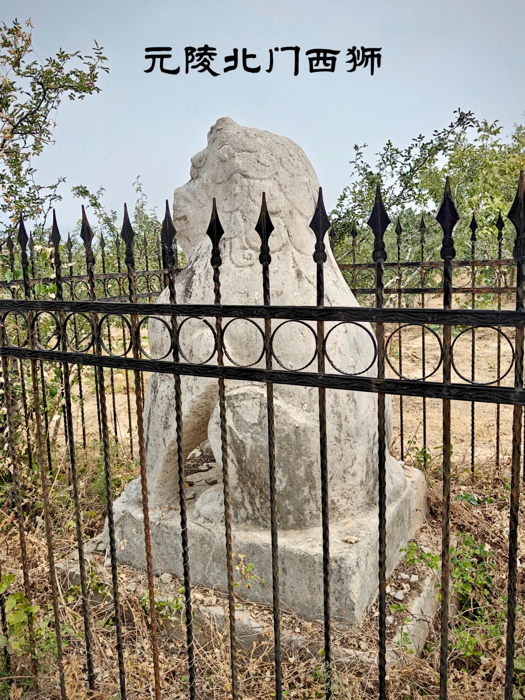 唐元陵内城陵园辟有四门,四门外各列置石狮一对,共8尊。 东门:东门北狮疑似埋入地下,东门南狮存于富平文庙; 南门:两狮均毁(官方勘探报告中称损毁严重); 西门:两狮均存(一个非常有意思的现象是石狮与门阙之间的距离较远,很奇特); 北门:两狮均存。另存有5匹仗马,无控马官。