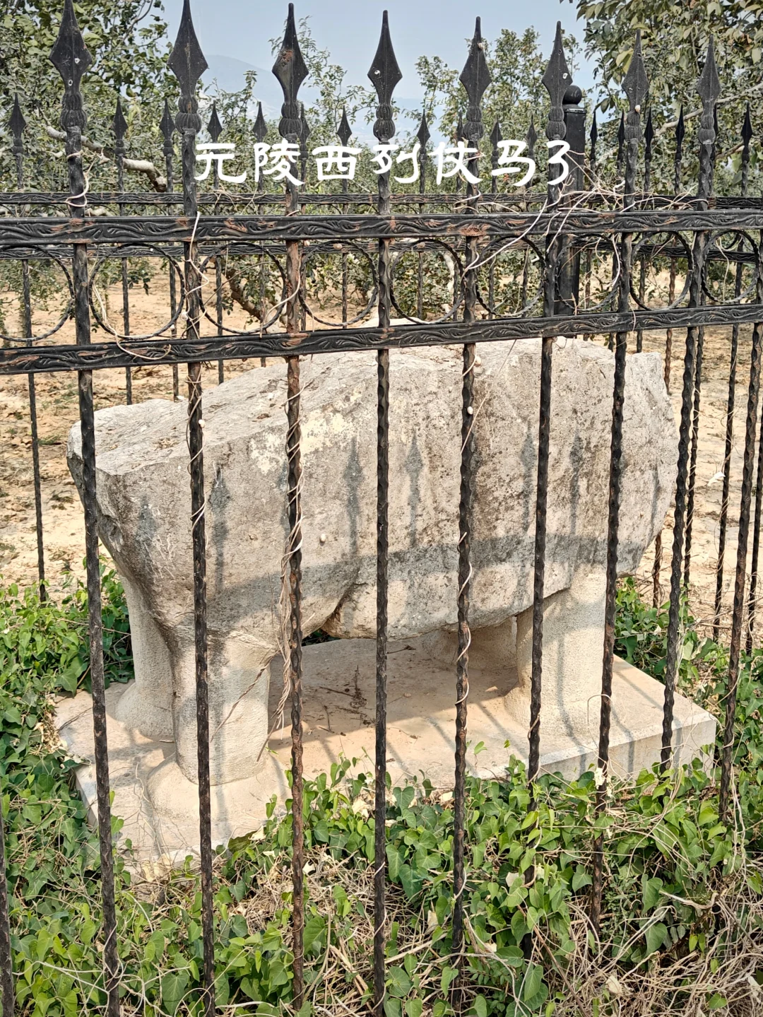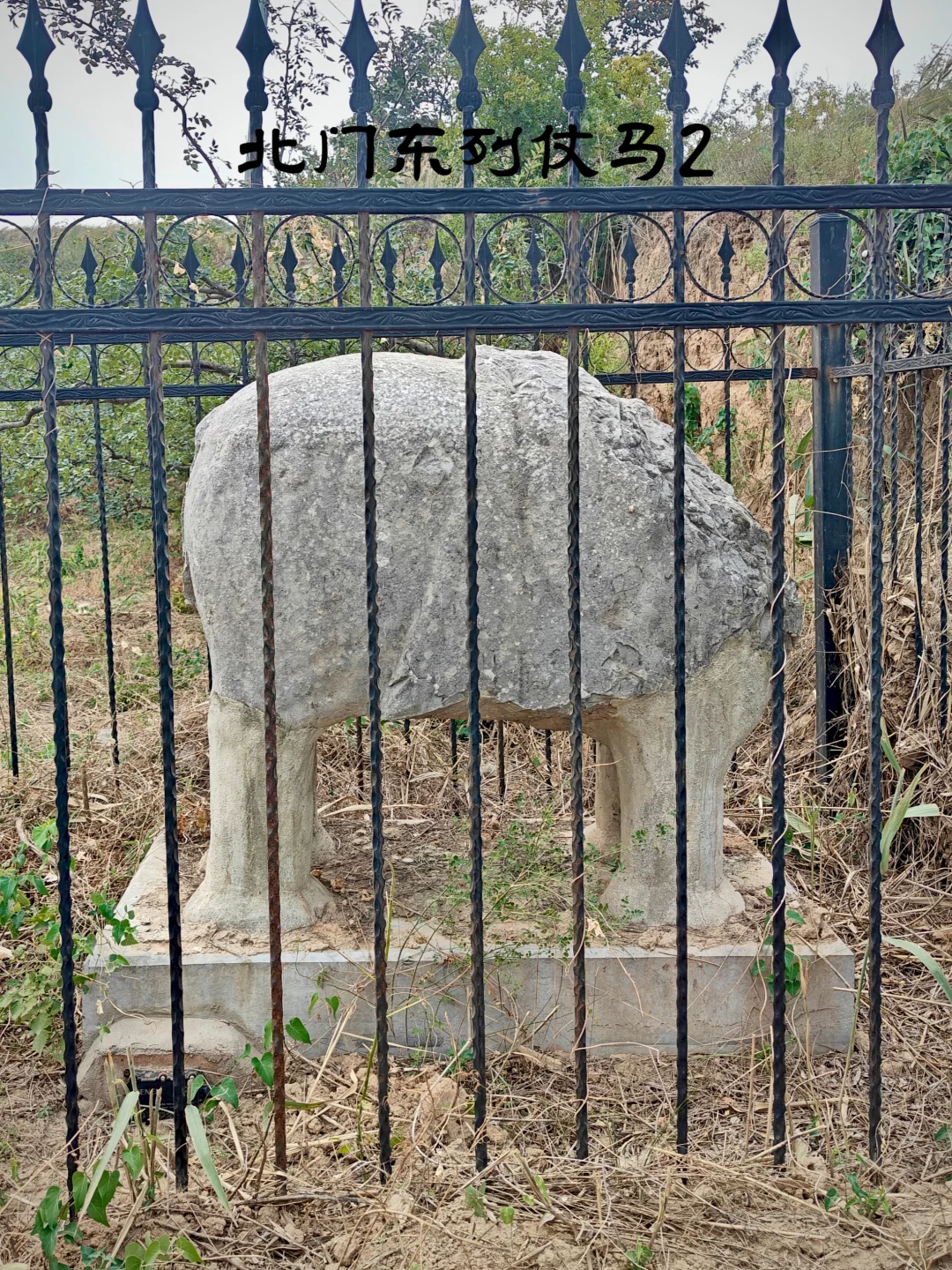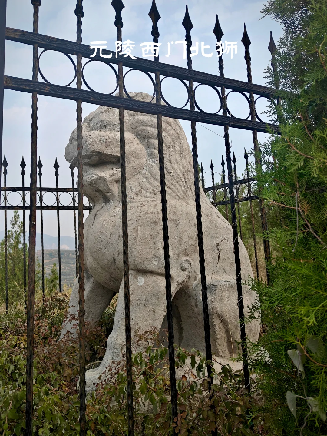唐元陵内城陵园辟有四门,四门外各列置石狮一对,共8尊。 东门:东门北狮疑似埋入地下,东门南狮存于富平文庙; 南门:两狮均毁(官方勘探报告中称损毁严重); 西门:两狮均存(一个非常有意思的现象是石狮与门阙之间的距离较远,很奇特); 北门:两狮均存。另存有5匹仗马,无控马官。