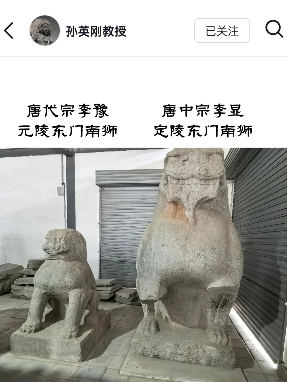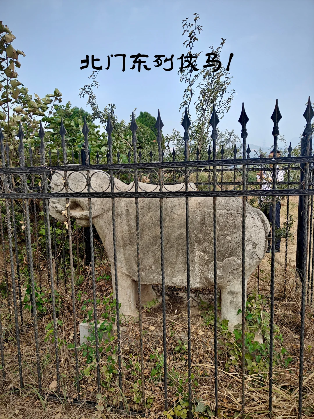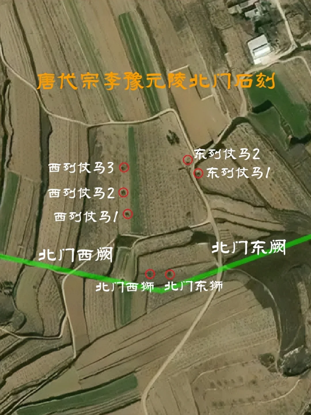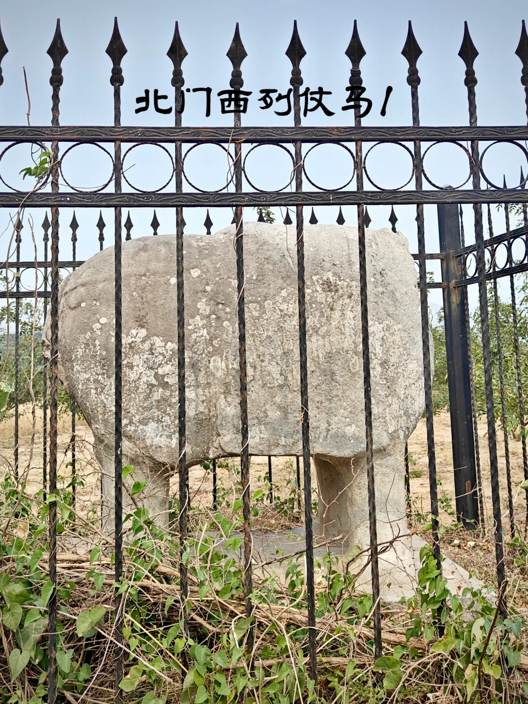 唐元陵内城陵园辟有四门,四门外各列置石狮一对,共8尊。 东门:东门北狮疑似埋入地下,东门南狮存于富平文庙; 南门:两狮均毁(官方勘探报告中称损毁严重); 西门:两狮均存(一个非常有意思的现象是石狮与门阙之间的距离较远,很奇特); 北门:两狮均存。另存有5匹仗马,无控马官。