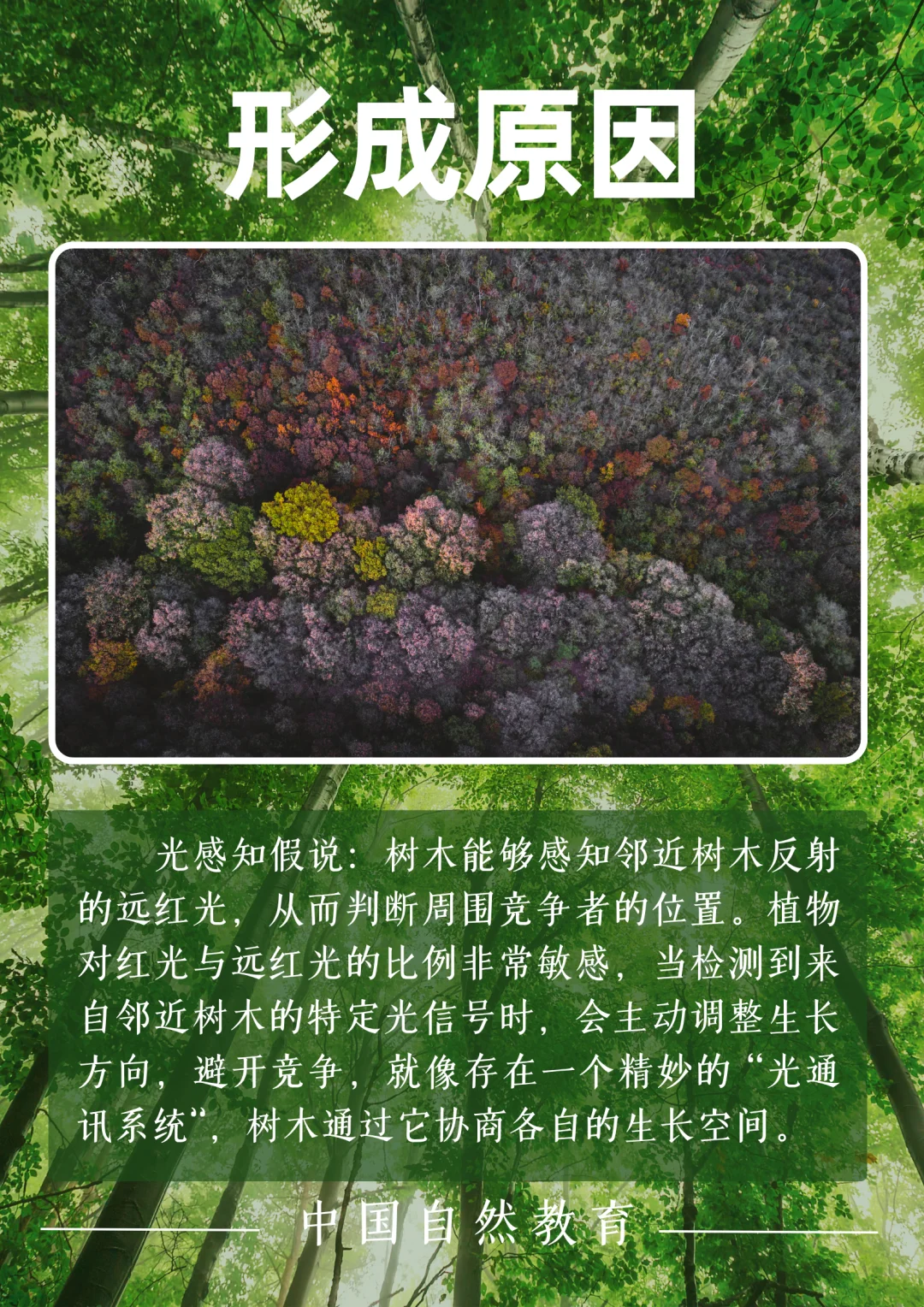 科学家说,这份“距离感”藏着树木的生存智慧:有的是为了避免叶片摩擦造成的物理损伤,有的是为了让每片叶子都能高效进行光合作用,还有的是通过根系传递化学信号,提前“协商”好生长边界。没有语言,没有指令,树木用最安静的方式,在拥挤的森林里为彼此留出空间,实现了“共生共赢”的平衡。
