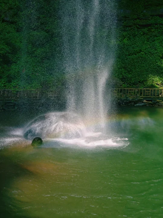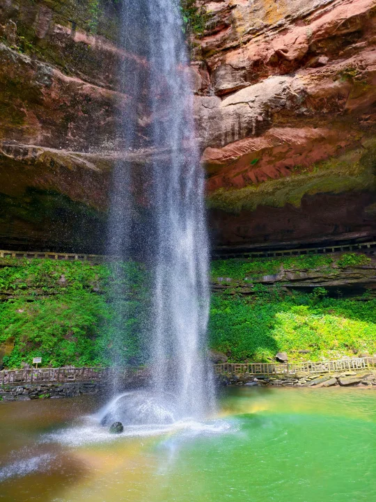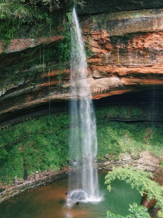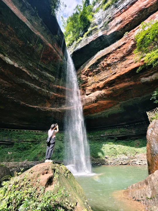 核心景点,巨出片,悬崖飞瀑与丹霞地貌相结合,晴天阳光照射还可以看见彩虹。