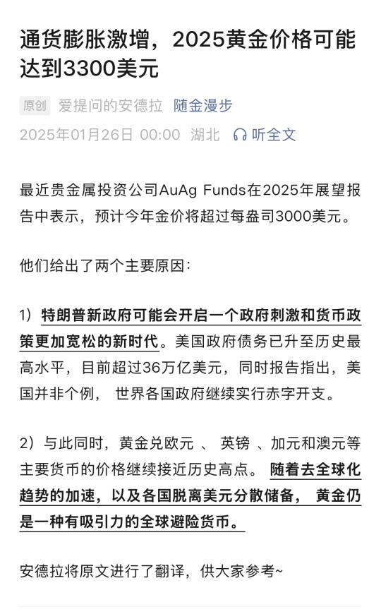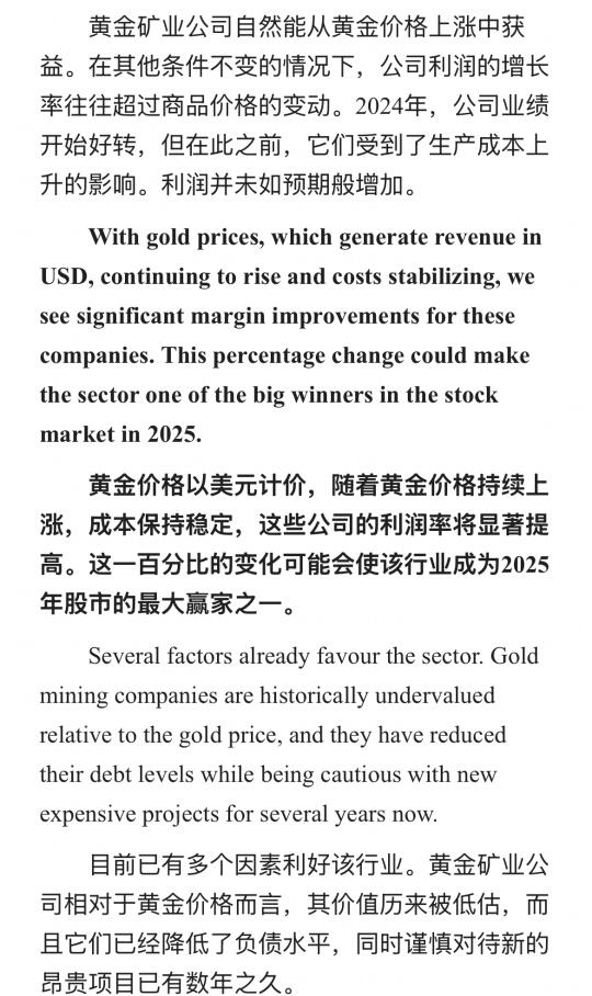 黄金价格再刷新高:COMEX黄金直线拉升,最高触及2806.9美元/盎司,再度刷新历史新高。 . 这个消息恰好和我在1月中旬在星球发的投资笔记,来自Auag fund黄金展望观点呼应,同时还机构还提到今年的黄金矿业公司可能成为2025年gu市最大赢家之一。 具体的观点看图片~