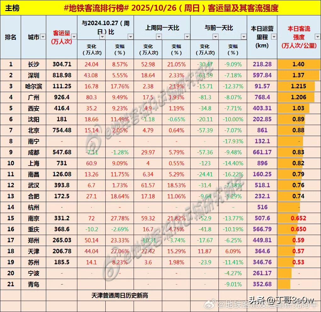 天津周日地铁客流量达206万人次以上,创历史周末最高纪录[呲牙][呲牙][呲牙] 爆料 身边事 2025年10月26日 星期天 全国重点城市轨道交通客流量排行榜: 广州:926.40万广州地铁 深圳:818.98万深圳地铁 北京:754.48万北京身边事 上海:731.00万 成都:547.68万 西安:416.40万西安身边事 武汉:393.80万武汉地铁 杭州:360+万杭州身边事 重庆:368.60万重庆身边事 南京:331.20万南京地铁 长沙:304.71万 郑州:265.03万郑州爆料 天津:206.78万天津身边事 苏州:185.50万 沈阳:181.00万沈阳身边事 合肥:172.50万 青岛:120+万青岛爆料 南昌:126.08万 宁波:110+萬 哈尔滨111.25万哈尔滨爆料 南宁:100万+