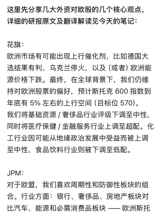 仅仅几个月前,看好欧洲市场的理由还寥寥无几。如今,在地缘和货币的顺风推动下,欧洲市场正一路高歌猛进。 梳理了外资机构的核心观点,见图片~ 仅为个人纪录,不构成任何建议