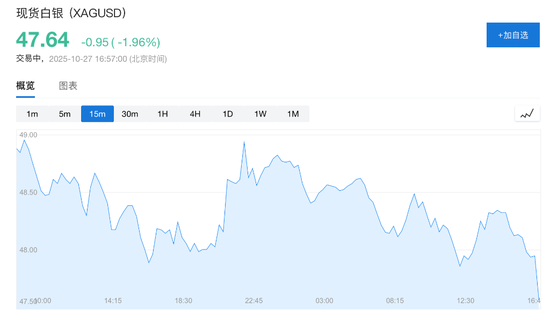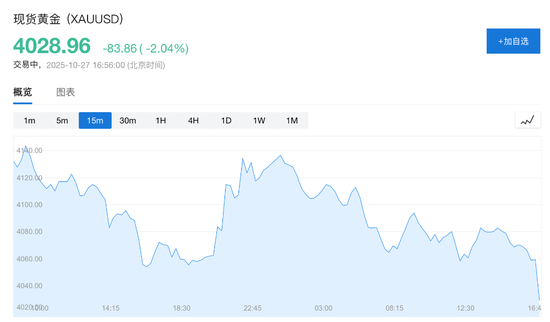 避险资产现货黄金日内跌超2%至每盎司4028美元。现货白银跌超1%。