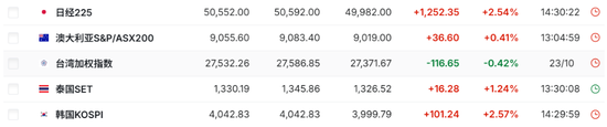 日经225指数收涨2.5%,报50512.32点。日本东证指数收涨1.7%,报3325.05点。韩国首尔综指收盘涨2.6%,报4042.83点。三星电子股价涨超2%,至纪录高位。澳大利亚S&P/ASX200指数一度上涨0.7%。