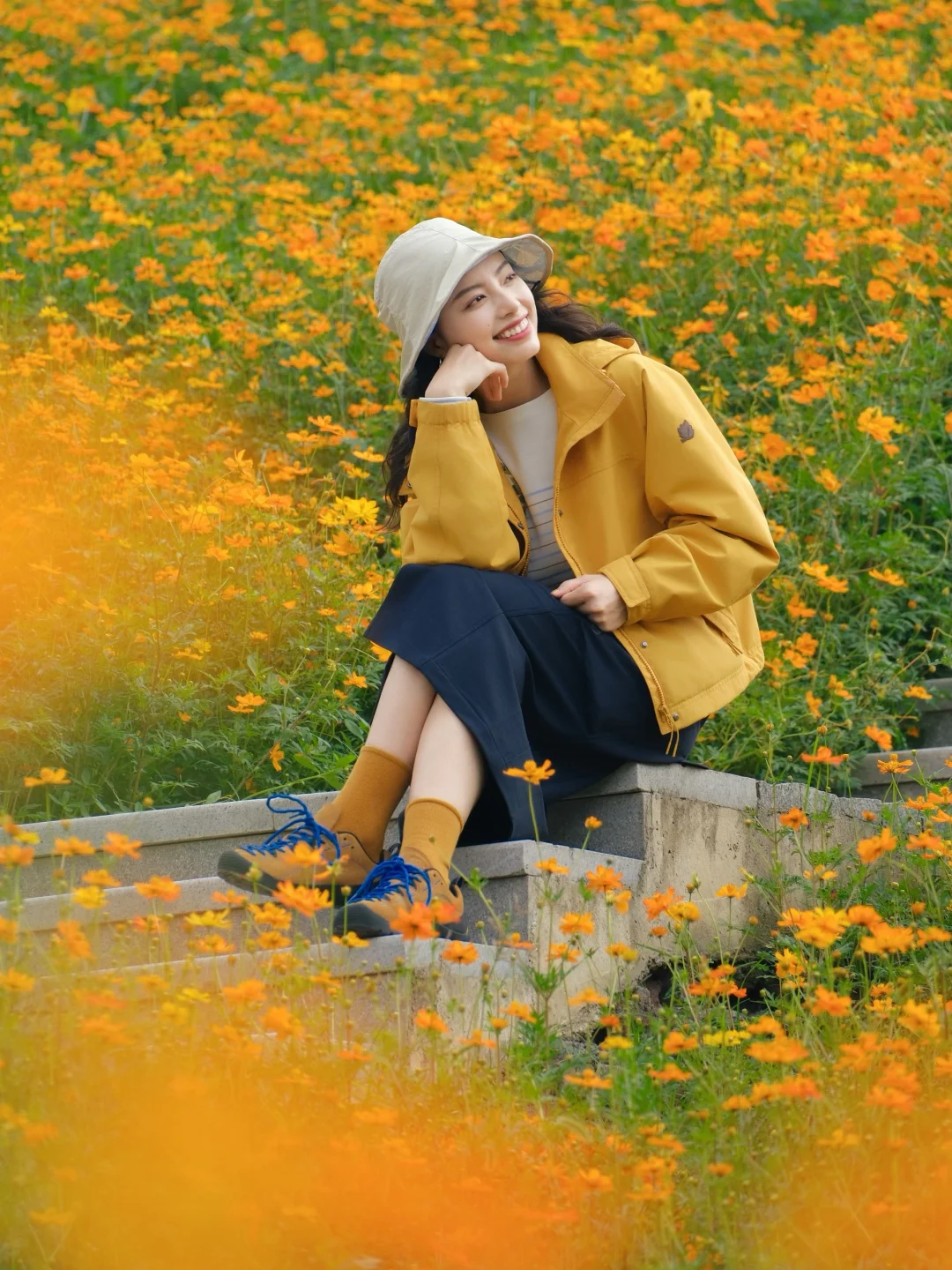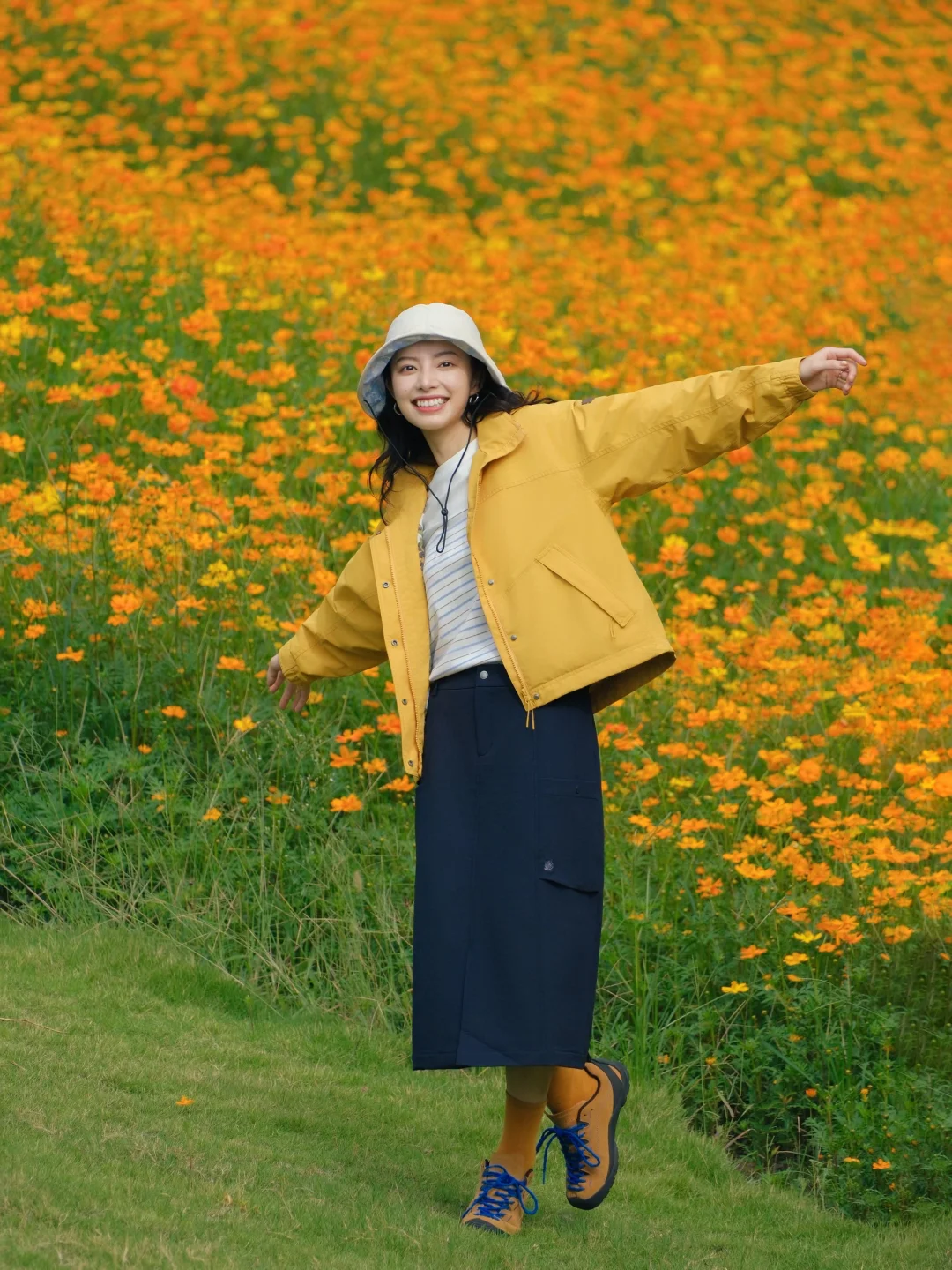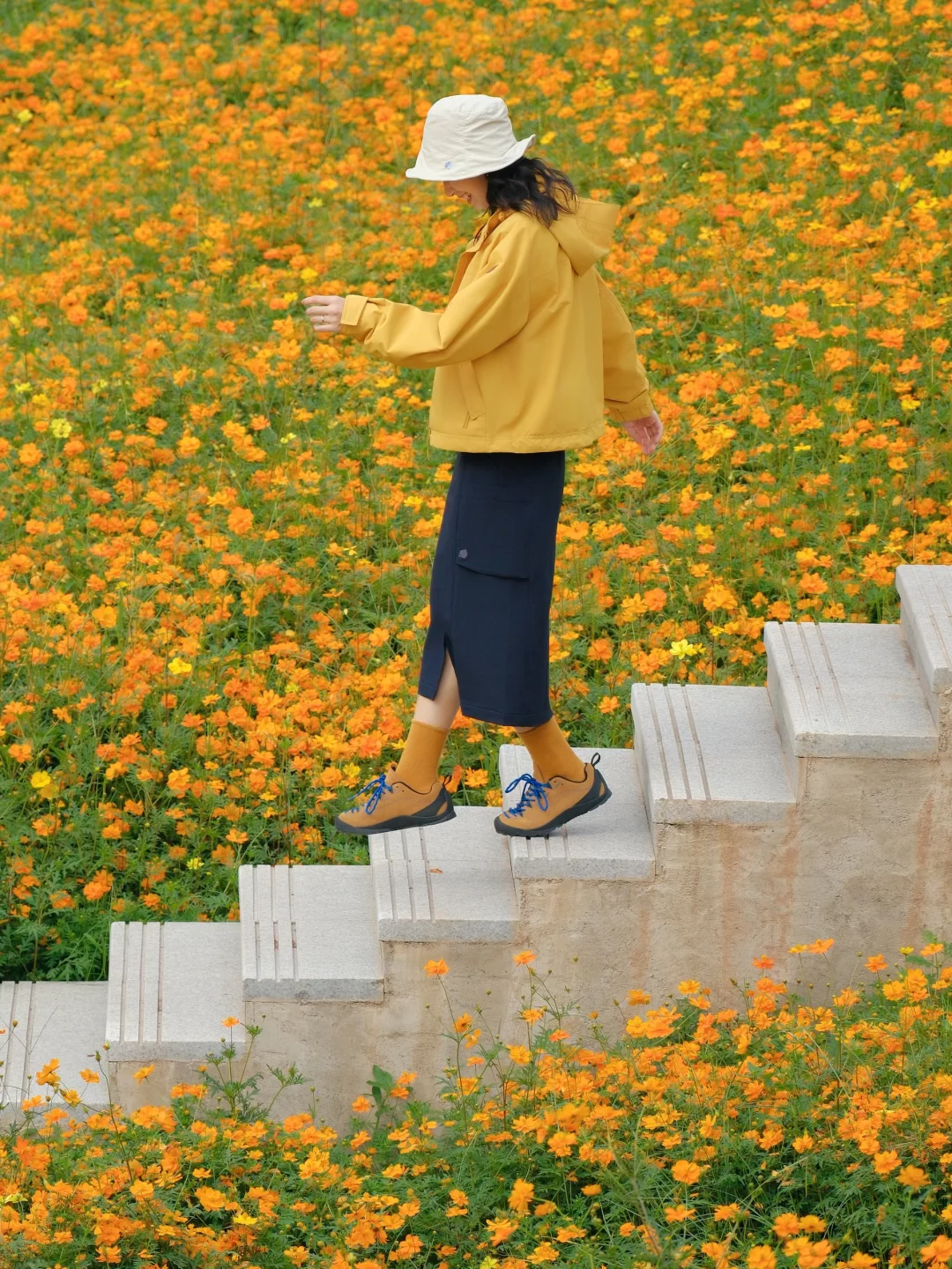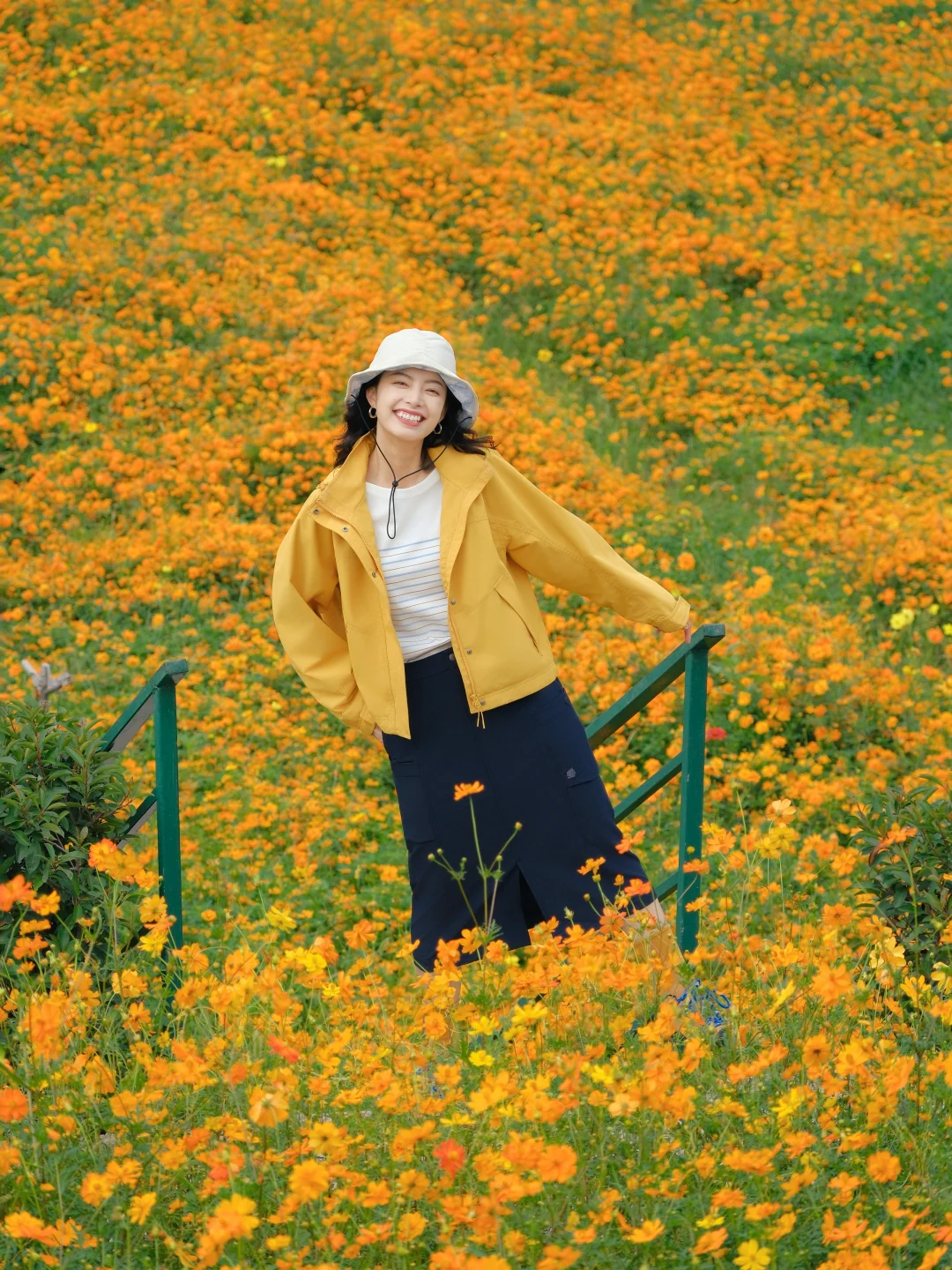 重庆的金秋十月虽然没有彩林,但我们有热烈的金色花海呀! 这次发现几个不一样的拍花海机位,以及常用的几个拍照姿势要点,给大家分享一下吧~ - 📷拍摄建议: 1️⃣天气好的时候,低机位拍花海和蓝天,建议找一片比较低的花海做前景,也可以把花间的小路遮住,人物站到更高位置的花间小路/楼梯上,这样拍出来更有层次 ✔️倚着栏杆仰头摸帽子感受风 2️⃣坐在有坡度的阶梯上,用低矮处的花做前景。手可以撑在膝盖上,身体有支撑拍出来肢体会更放松 ✔️脸要朝向有光线的防线 ✔️眼睛尽量看环境里的高亮处,这样拍出来才有眼神光 3️⃣找一找花和周围草坪之间形成的好看线条,用线条做画面的分割线也会很好看 4️⃣好用的拍照姿势: ✔️道路上走来走去,注意拍照时的走路姿势需要比平时走路慢一点,尤其是踮脚的瞬间 ✔️侧面倒向花海/背对倒向花海 ✔️坐在花间小路上/坐在花间凳子上,手部要找一个支撑点,身体姿态更自然 - 🧥穿搭建议: 今年发现我好适合暖黄色系的衣服,秋天就又入了一件孙阳同款的Lafuma SANGAR冲锋衣,利落的版型轻松穿出机能风,搭配长裙日常穿着时尚又出片。防风防雨的面料也能轻松应对各种户外活动,无论是城市出游、户外登山都能一件满足!