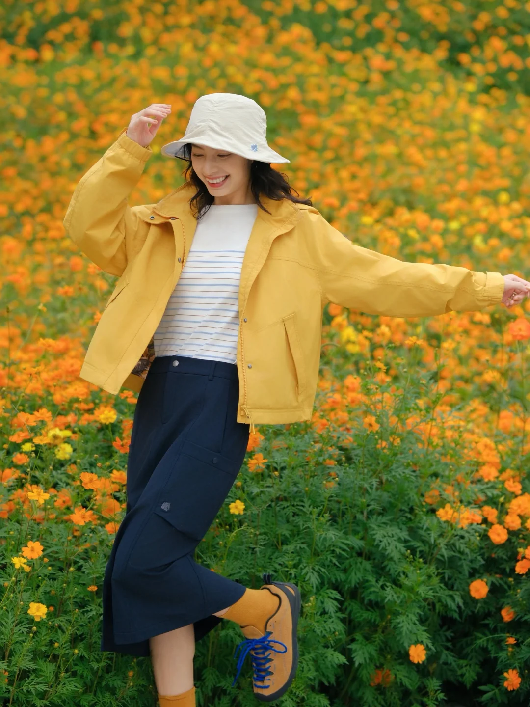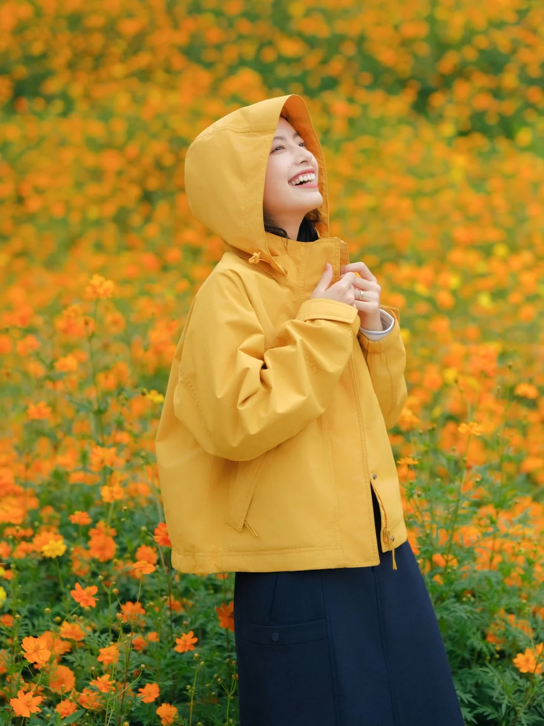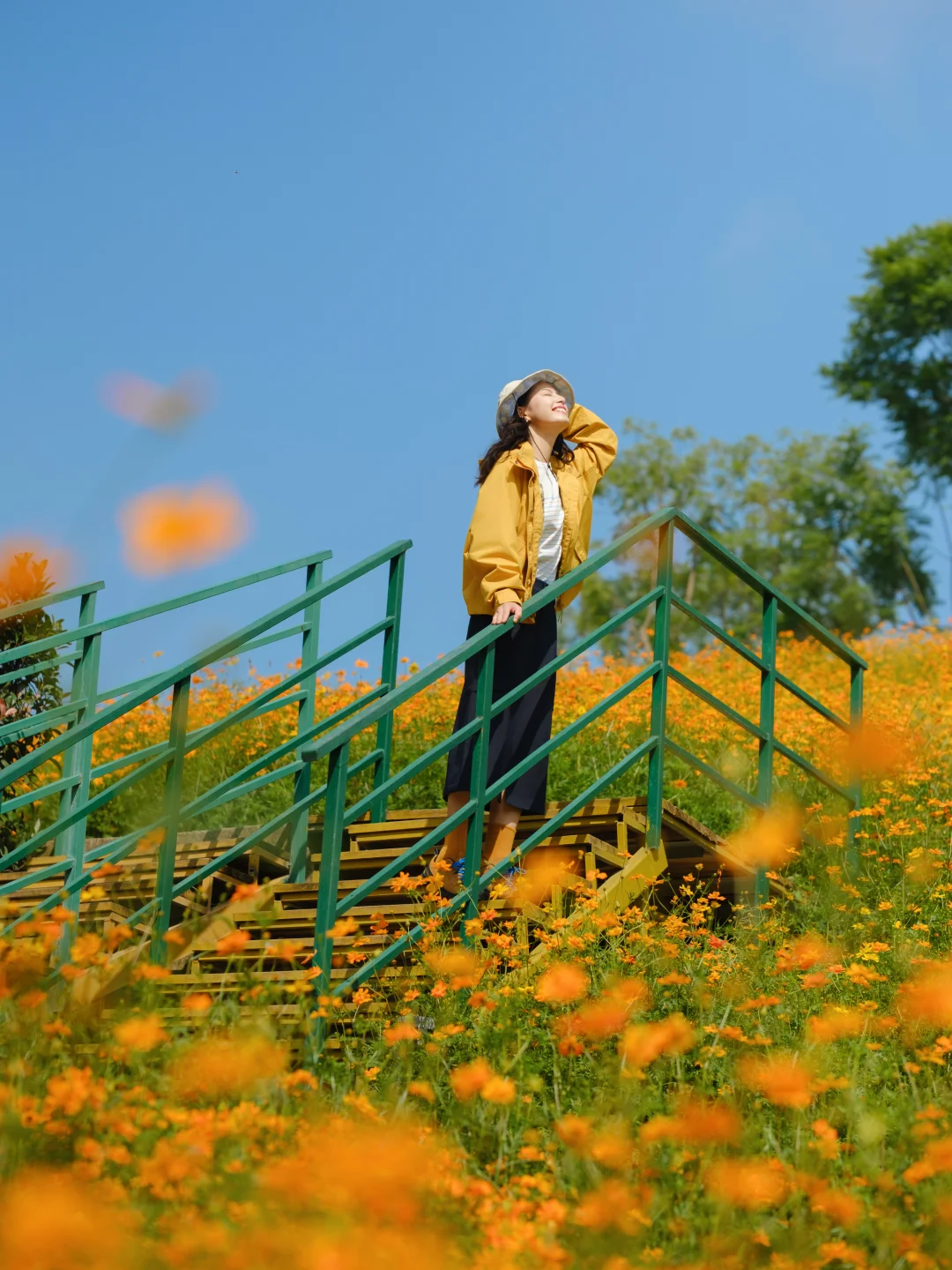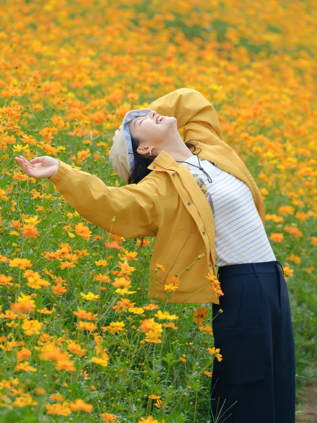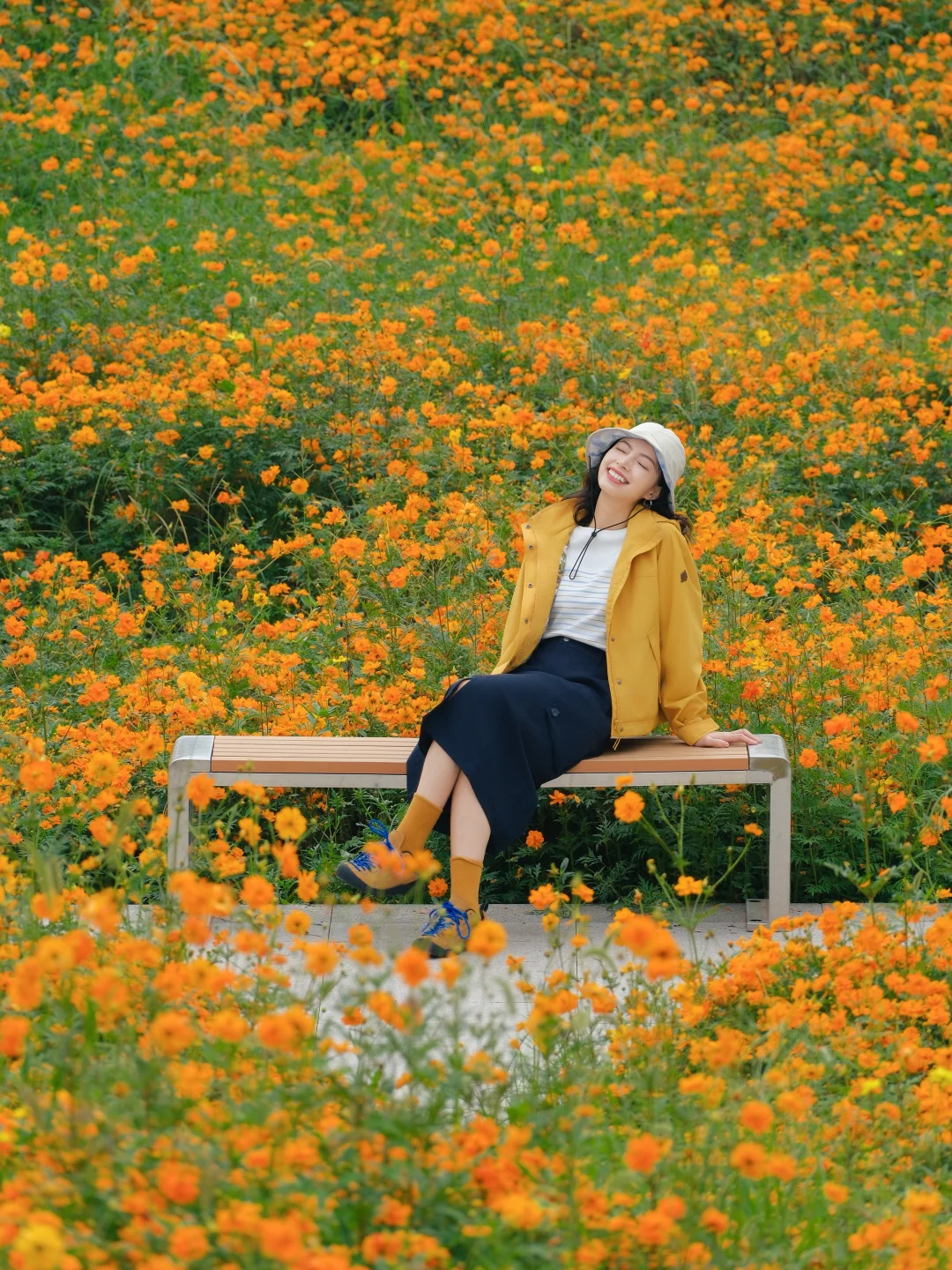 重庆的金秋十月虽然没有彩林,但我们有热烈的金色花海呀! 这次发现几个不一样的拍花海机位,以及常用的几个拍照姿势要点,给大家分享一下吧~ - 📷拍摄建议: 1️⃣天气好的时候,低机位拍花海和蓝天,建议找一片比较低的花海做前景,也可以把花间的小路遮住,人物站到更高位置的花间小路/楼梯上,这样拍出来更有层次 ✔️倚着栏杆仰头摸帽子感受风 2️⃣坐在有坡度的阶梯上,用低矮处的花做前景。手可以撑在膝盖上,身体有支撑拍出来肢体会更放松 ✔️脸要朝向有光线的防线 ✔️眼睛尽量看环境里的高亮处,这样拍出来才有眼神光 3️⃣找一找花和周围草坪之间形成的好看线条,用线条做画面的分割线也会很好看 4️⃣好用的拍照姿势: ✔️道路上走来走去,注意拍照时的走路姿势需要比平时走路慢一点,尤其是踮脚的瞬间 ✔️侧面倒向花海/背对倒向花海 ✔️坐在花间小路上/坐在花间凳子上,手部要找一个支撑点,身体姿态更自然 - 🧥穿搭建议: 今年发现我好适合暖黄色系的衣服,秋天就又入了一件孙阳同款的Lafuma SANGAR冲锋衣,利落的版型轻松穿出机能风,搭配长裙日常穿着时尚又出片。防风防雨的面料也能轻松应对各种户外活动,无论是城市出游、户外登山都能一件满足!