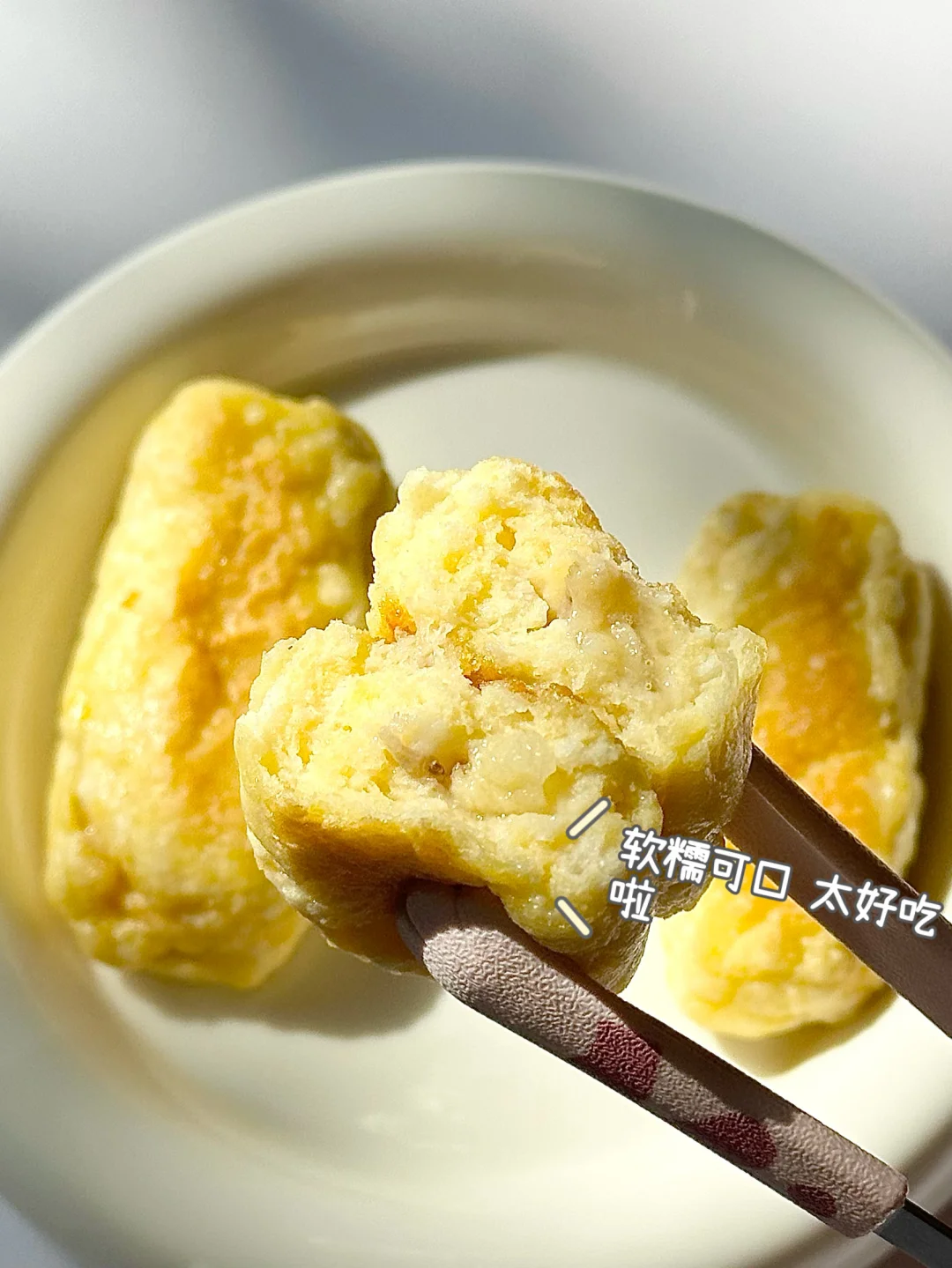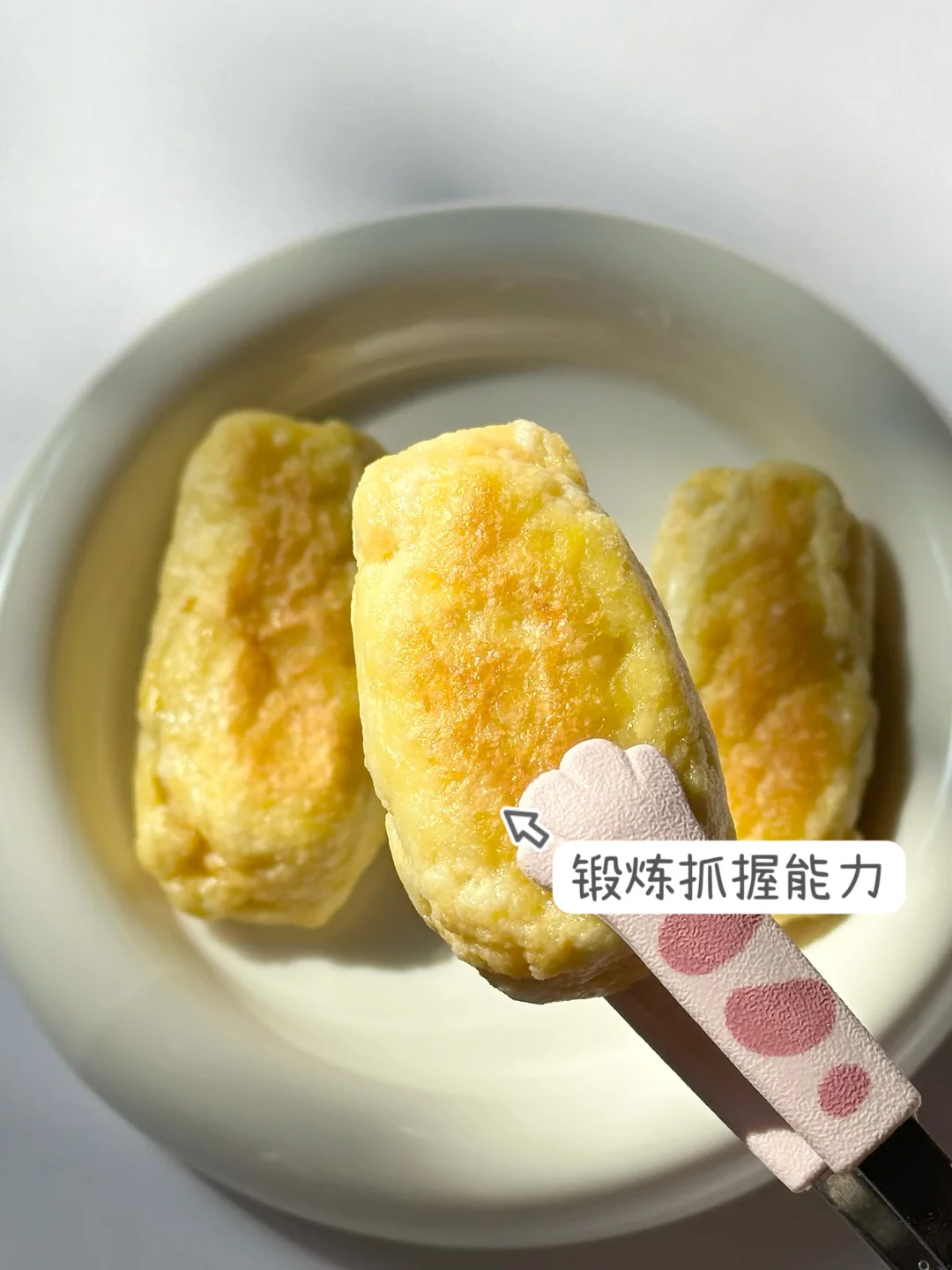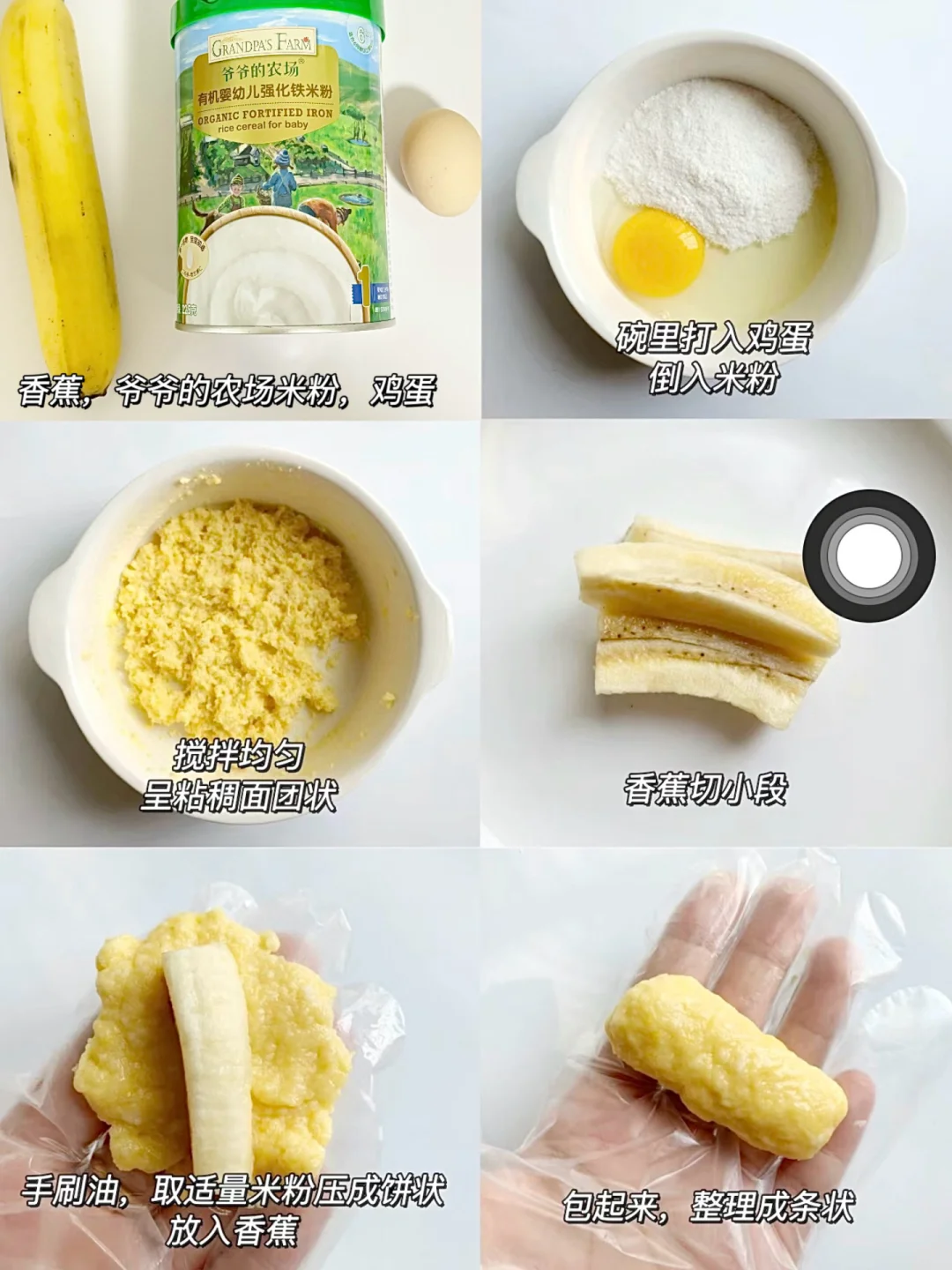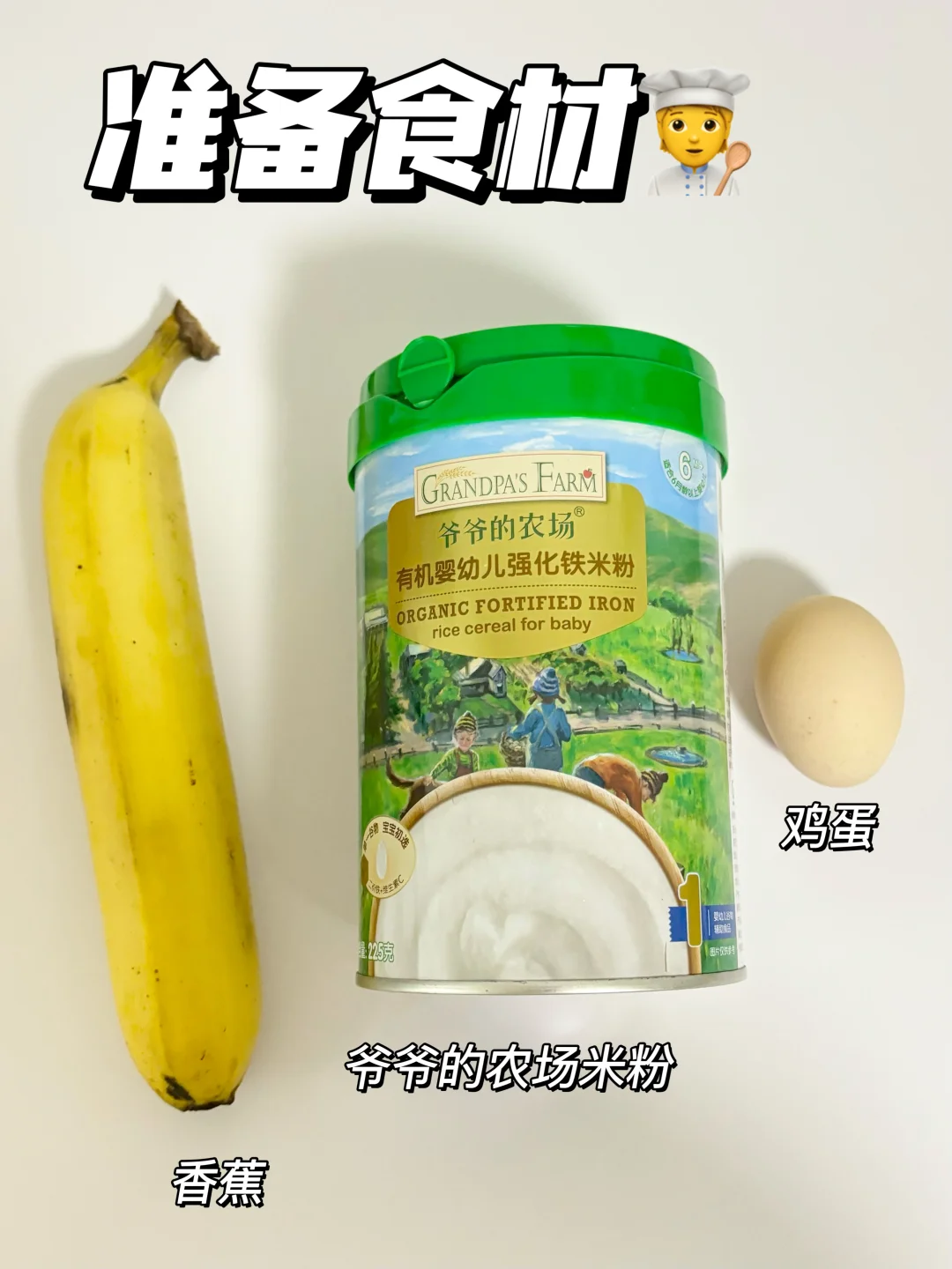 口感松软香甜~配上香甜可口的香蕉夹心,一口爆浆[色色R] 给宝宝当做早餐和下午茶都是非常不错的哦~ 还可以锻炼宝宝咀嚼和抓握能力![哇R] - 🧑🍳具体教程见上图~ - 📝小贴士: 1️⃣:蛋清排敏了就可以用一整颗鸡蛋,没有排敏两颗蛋黄 2️⃣:不同牌子的米粉吸水性不同,麻麻们要适当调整 - 用到的米粉是爷爷的农场家的有机米粉,米粉原料是有机大米,配料表很干净~二价铁高达5.8mg搭配维C,粉质细腻易冲泡很适合宝宝辅食初添加!铁罐包装,方便存放~很适合初添加辅食的宝宝!