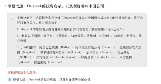 3、摩根大通梳理了这波受deepseek利好的板块:云平台、应用软件、边缘设备、边缘AI,并给出了中国公司的推荐名单。