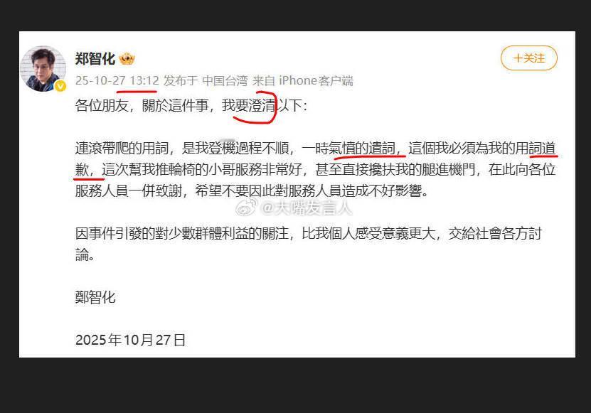 图5中郑智化对机场服务人员致谢,并不能催生出话题郑智化致歉吧,他只是说澄清呀,为用词"连滚带爬"而道歉,至于他提到的“冷眼看着我”、“最没人性”,他就不解释了对吧?