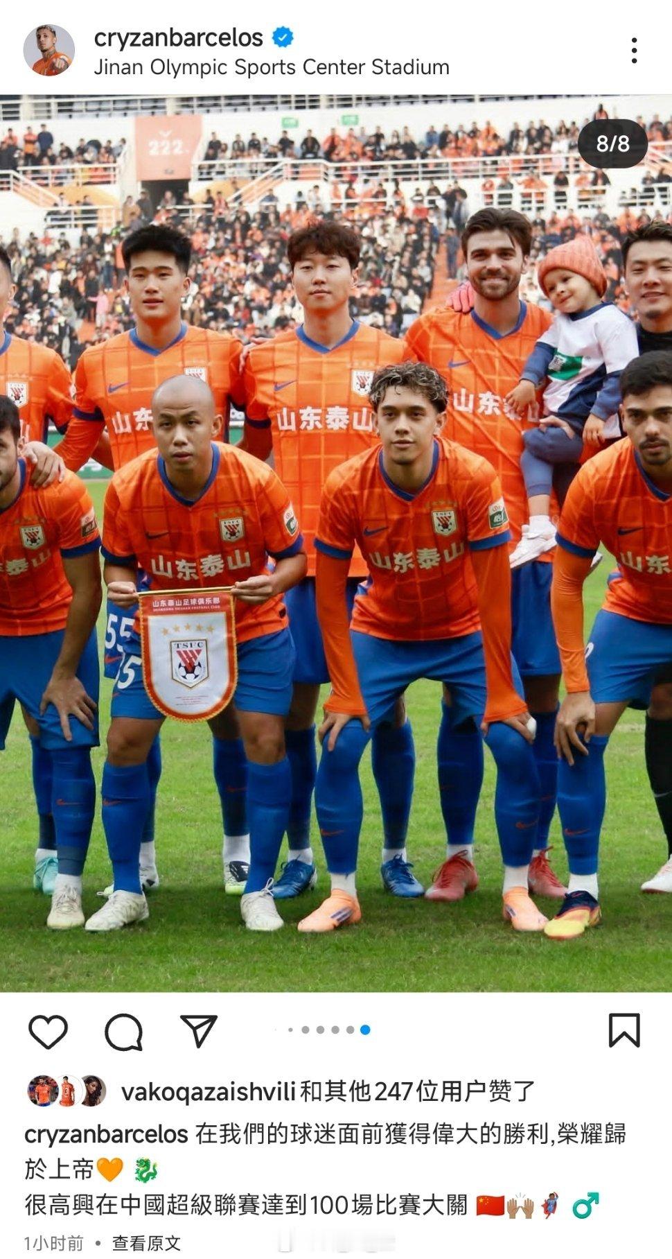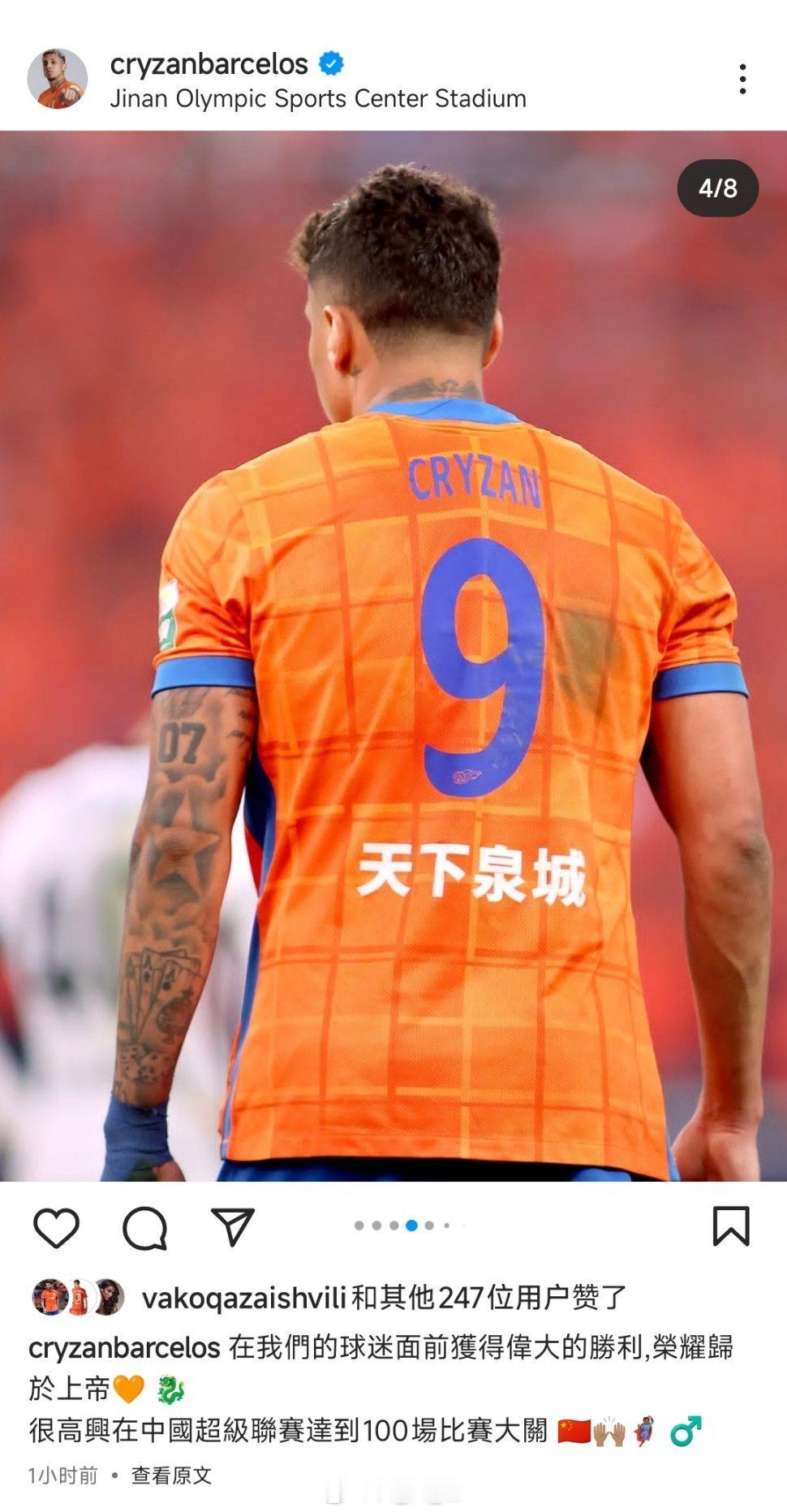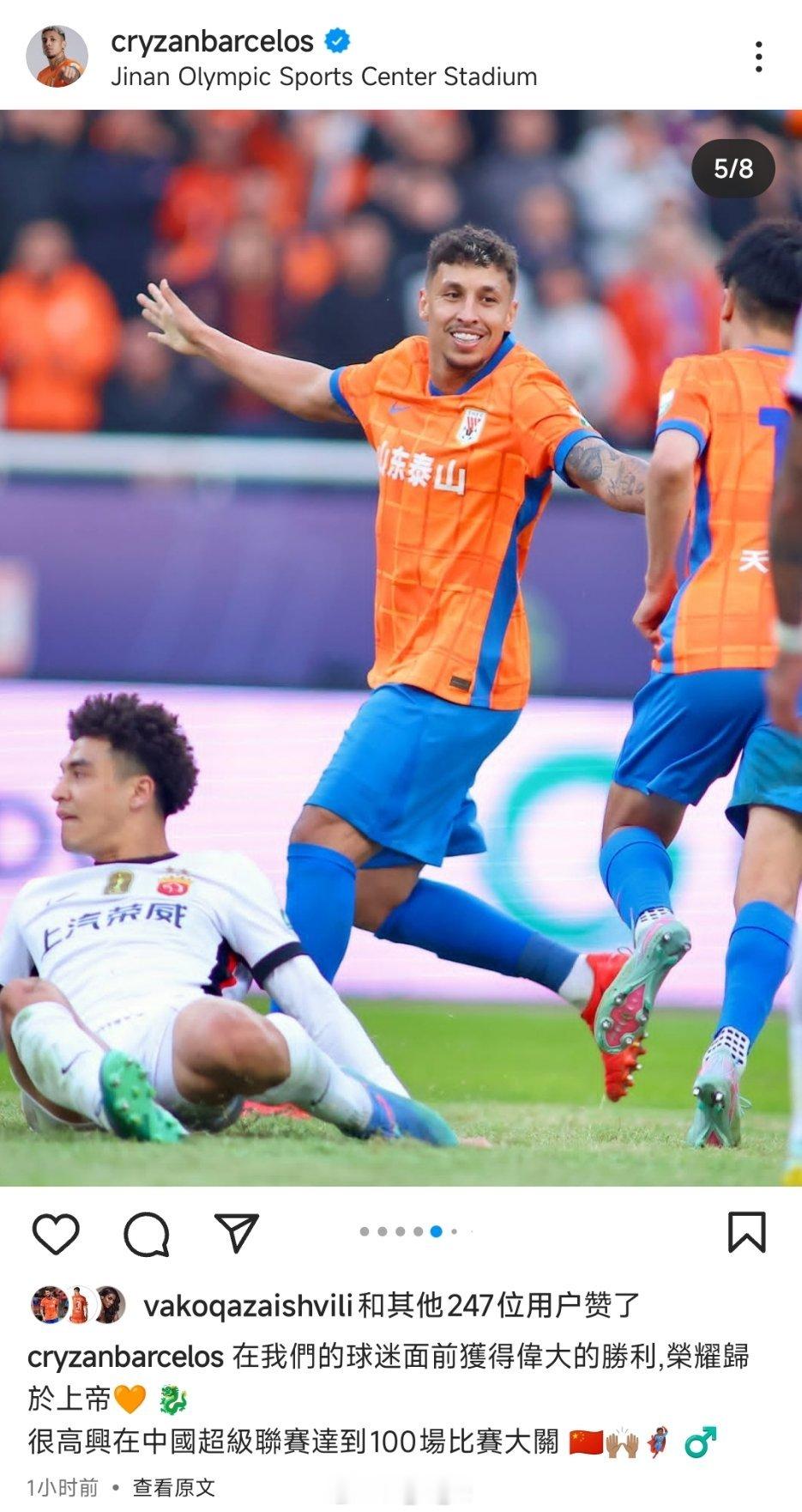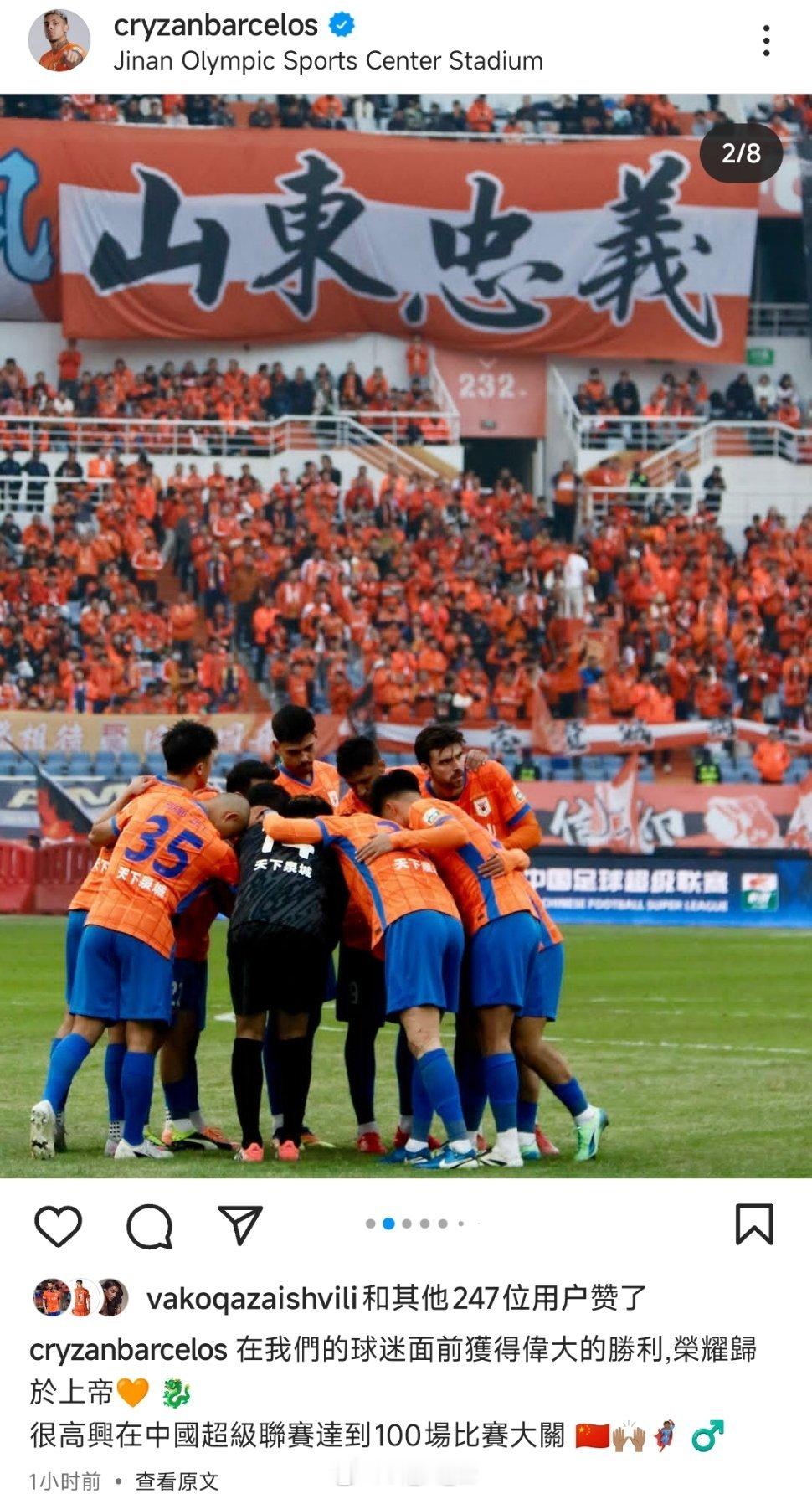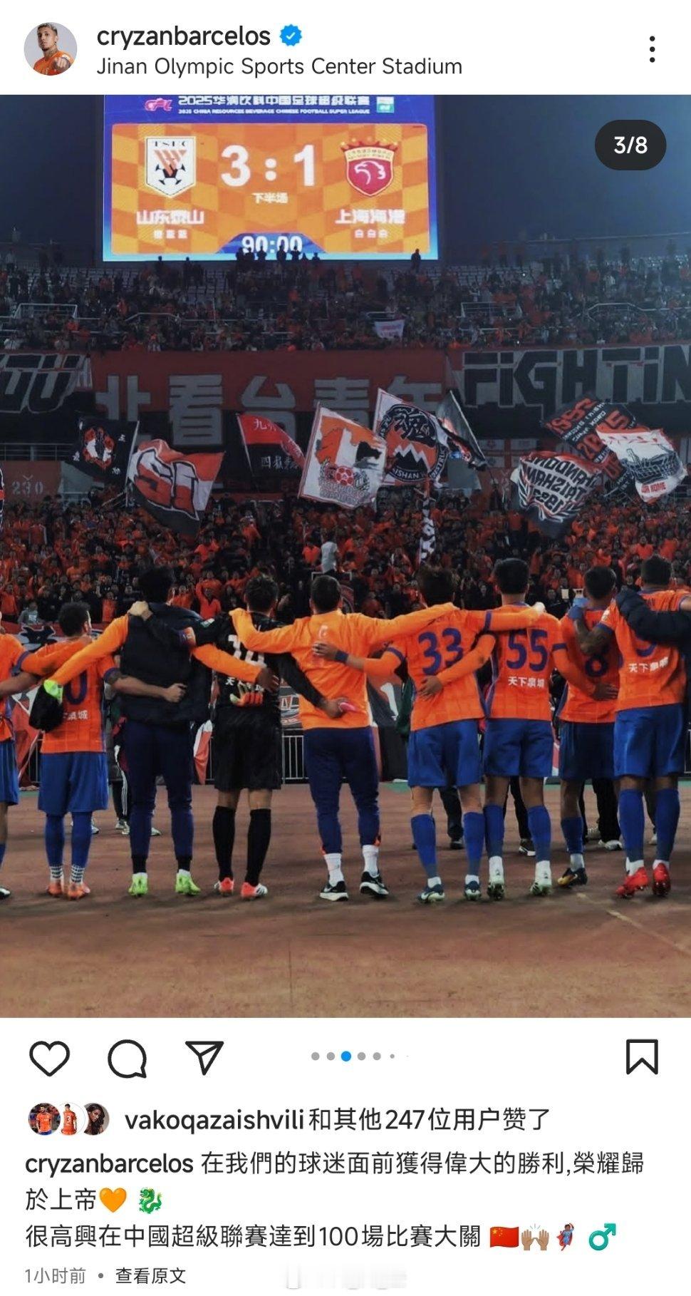 克雷桑更新社媒,并配文:我们球迷的面前收获了伟大的胜利。很高兴在中国超级联赛达到了100场比赛大关。自由橙[超话]山东泰山[超话]