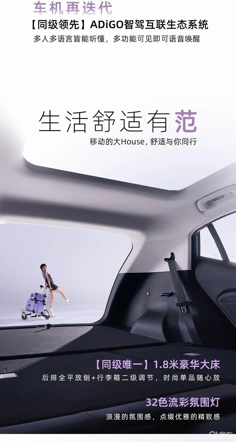 空间方面,新车采用5座布局,1.8米豪华大床后排全平放倒+行李箱二级调节,时尚单品随心放;32色流彩氛围灯浪漫的氛围感,点缀优雅的精致感。