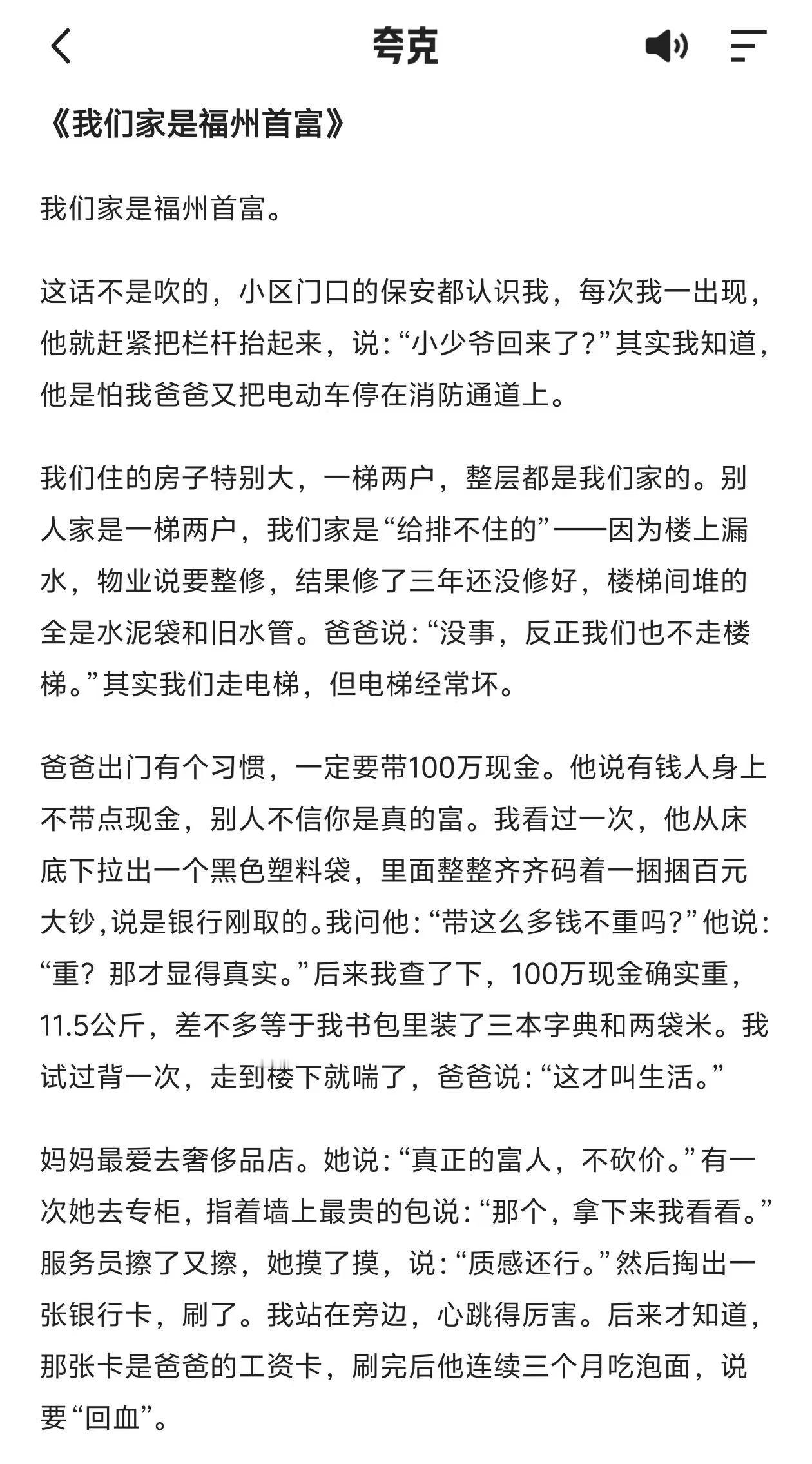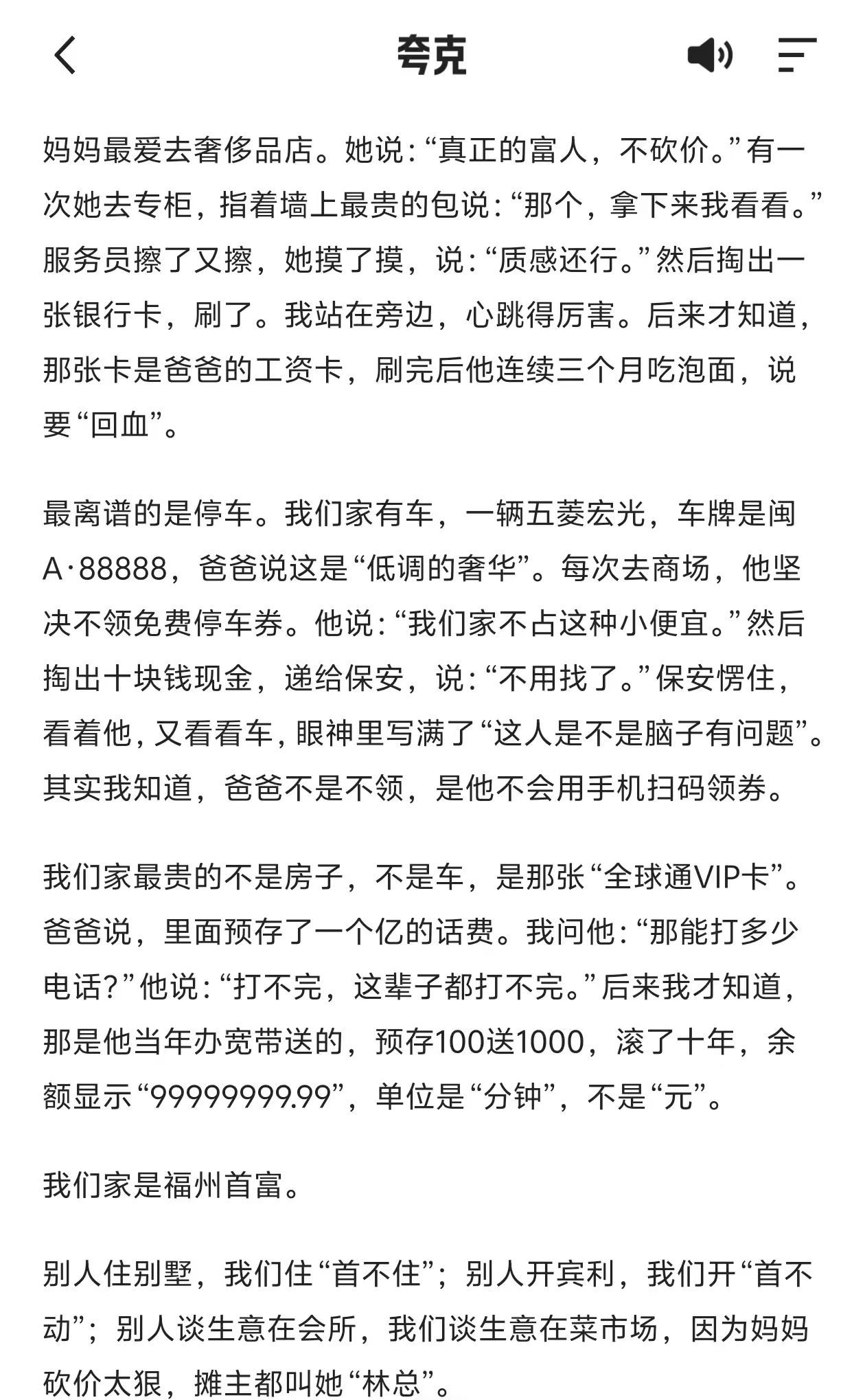 没有你想不到的顶级细糠这就是夸克的反差感吗?原来除了有问题问夸克、能有专业的解答,怎么还可以让夸克写小说了?穷人视角的霸总爽文真的很好笑,嘴上把“有钱”挂嘴边,字里字外却全是藏不住的心酸,笑点拉满了!
