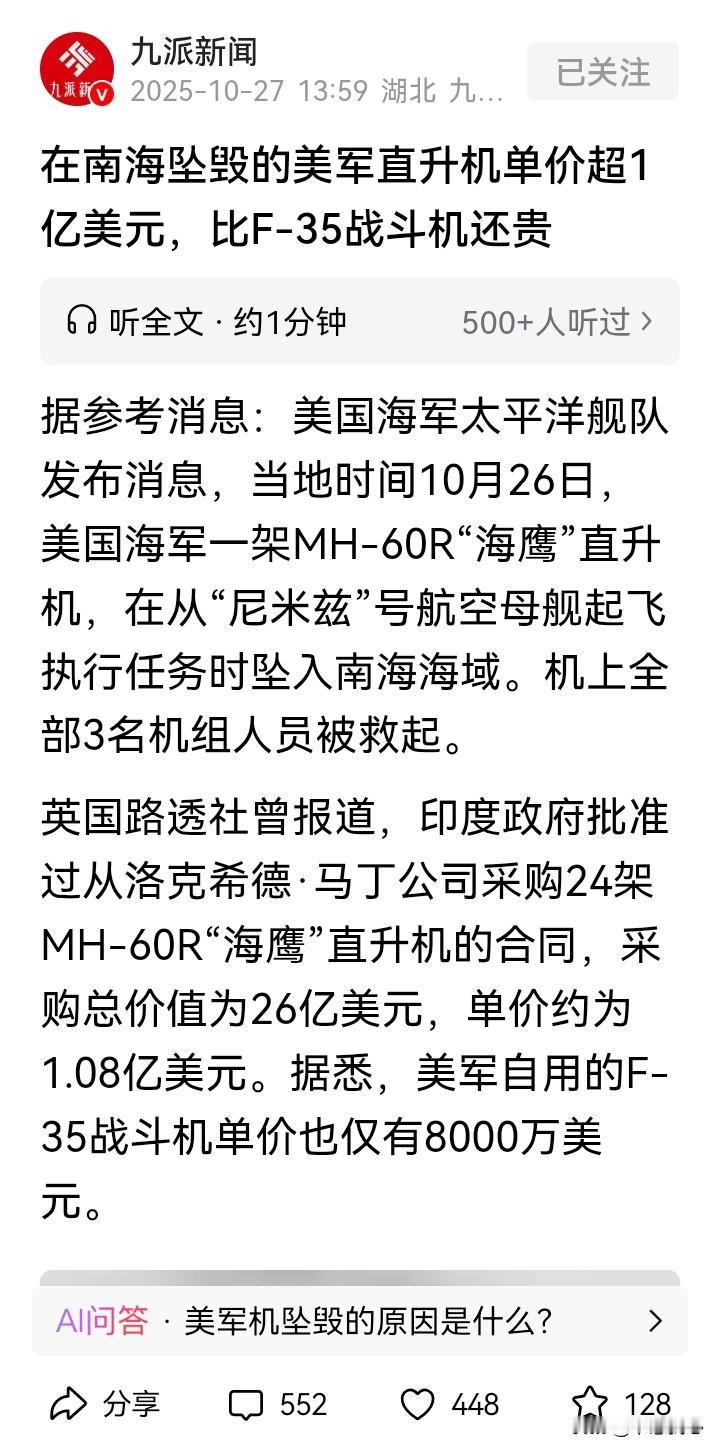 从美军一个小时内摔了2架战机,我终于明白了为何美国欠债突破38万亿,而美国政府又为何停摆快1个月了…… 你知道现在美国欠了多少钱吗?前几天,10月22日,美国财政部的数据显示,美国国债总额首次突破38万亿美元!考虑到美国人口3.4亿,那每人都要承担10万多了吧。 而其实,美国国债8月份的时候是37万亿,才2个月就又多了一万亿! 可以说这增长速度也是够快的。或许部分原因也是因为这个,美国联邦政府停摆了,10月份以来就是停摆状态,快1个月了,这样的好处之一,就是节省开支吧,解雇部分联邦政府雇员,而一些不得不坚持上班的,也是没有薪水,后续会否补发,还未确定。 可是,虽然政府停摆,军队是不能停摆的。比如,“尼米兹”航母就不远万里,到我们南海来了。这油钱花得能少吗? 然后,今天,“尼米兹”航母一下子,或者说啊还是间隔了1小时左右,摔了两架飞机。 先是一架MH-60R“海鹰”直升机,接着是F/A-18E“超级大黄蜂”战斗机。 超级大黄蜂,我还是知道的,战斗机很贵,查了一下,现在它的估算造价约为6000万美元。 接着是“海鹰”。“黑鹰”我就知道,之前有《黑鹰坠落》的电影,也看过《黑鹰传奇》的武侠小说,这个“海鹰”还是新名词。 一查不得了,这直升机比战斗机还贵。比如印度要采购24架“海鹰”,价值26亿美金,一架就要1.08亿了,比“超级大黄蜂”贵多了,即使是F-35战斗机单价也仅有8000万美元。 因此,今天的两架飞机,就是合计1.68亿美金了吧。好在机组人员都救了回来,因为你要培养这些人,据说要花和他们同重量的黄金。 因此,美军还是从大海里捞回来了6个金人吧…… 你再想想美军那么多航母、军事基地,为了维持它的所谓“全球霸主”,到南海、中东等地方去耀武扬威,光是军舰军机的开动、故障损耗,那是花钱如流水,因此美国的债台高筑,越筑越高,也就不足为奇了……
