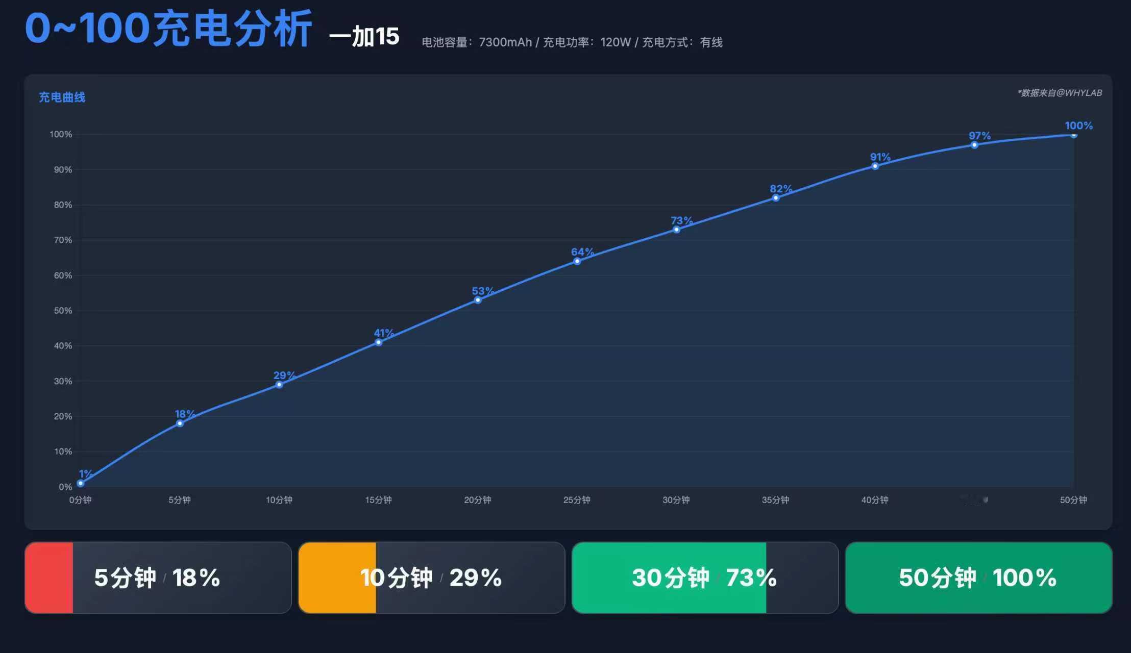 120W充电,5分钟充了18%,10分钟29%,30分钟就充到了73%,充满用时50分钟,速度也是非常快。不过有无线充电,平时开车充电也更方便。
