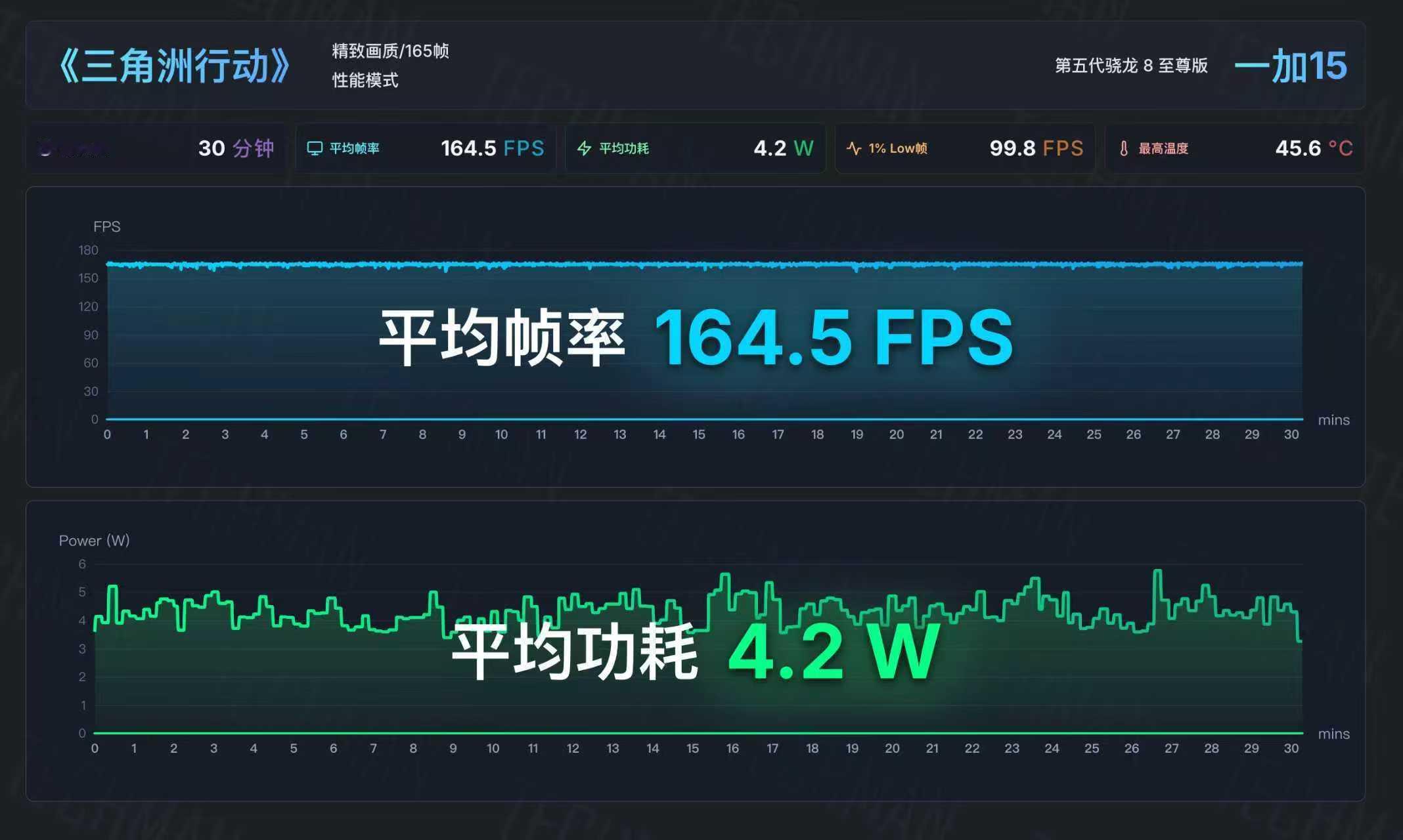 一加15还有一个非常亮眼的配置是屏幕刷新率,支持165Hz,我们也测试了三角洲行动,平均帧率可以达到164.5帧,功耗也只有4.2瓦。