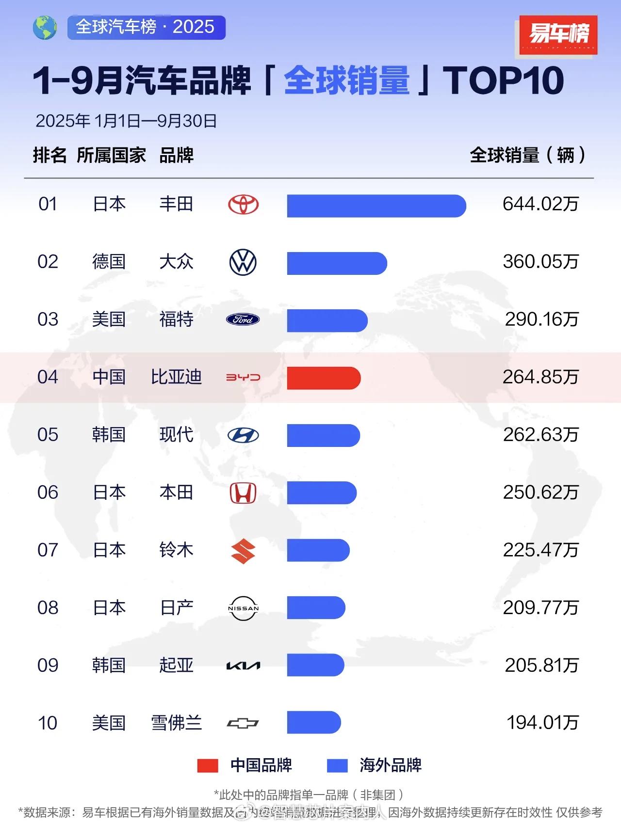 易车榜全球品牌汽车出货量排行,9月份比亚迪进入前三,前9个月比亚迪第四。特斯拉竟然没有进入前10。