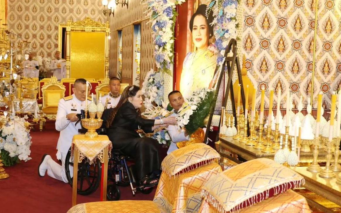 诗丽吉太后的四个子女守灵!10月27日诗丽吉太后的四个子女一起为母亲守灵,泰王穿着黑色高定西服很绅士,头发变得又黑又亮,应该是为了上镜染发,相比第一天看起来精神状态还不错。 太后的三个女儿,就数大女儿乌汶叻状态好,长发盘起高贵发髻非常的高贵,而且黑色发色不显老,反观诗琳通公主是自然老去,满头白发穿黑衣,一看就是老太太了。 值得一提的是小公主朱拉蓬不服老,长发飘飘还烫着卷发,看起来时髦不失女人味,可惜身体不好,坐在轮椅上为母亲守灵,是王太后四个子女中唯一一个体弱多病的孩子。