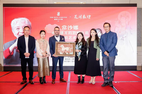 北京2025年10月28日/美通社/--由北京丽思卡尔顿酒店主办、常沙娜工作室出品、荣会文化与北京和合能量文化传播有限公司联合出品的"永远盛开的敦煌之花——常沙娜珐琅艺术珍藏展"于酒店艺术画廊正式启幕。万豪国际集团区域总经理Alfonso、华贸集团酒店管理中心总经理暨酒店业主代表魏丽芳女士、常沙娜工作室北京总部总经理兼敦煌常沙娜艺术中心主任曾薇瑄女士、展览出品人杨絮子女士、展览总策划宋宁颉先生、展览支持机构X美术馆馆长尤洋先生与主流媒体、特邀嘉宾及敦煌文化爱好者齐聚一堂,共同见证95岁"敦煌少女"常沙娜的珐琅和金丝琅彩作品与铜雕,展现敦煌美学的当代传奇。展览以常沙娜历时数十年创作的敦煌壁画手稿为原型呈现的20余幅珐琅和金丝琅彩作品及和国家级非遗传承人朱炳仁大师共创的珐琅铜雕《霓裳天马》。珐琅美学和敦煌文化的跨界融合,让千年壁画在金属胎体上"永生"。展期自2025年10月28日至2026年1月31日,每日免费对公众开放。
