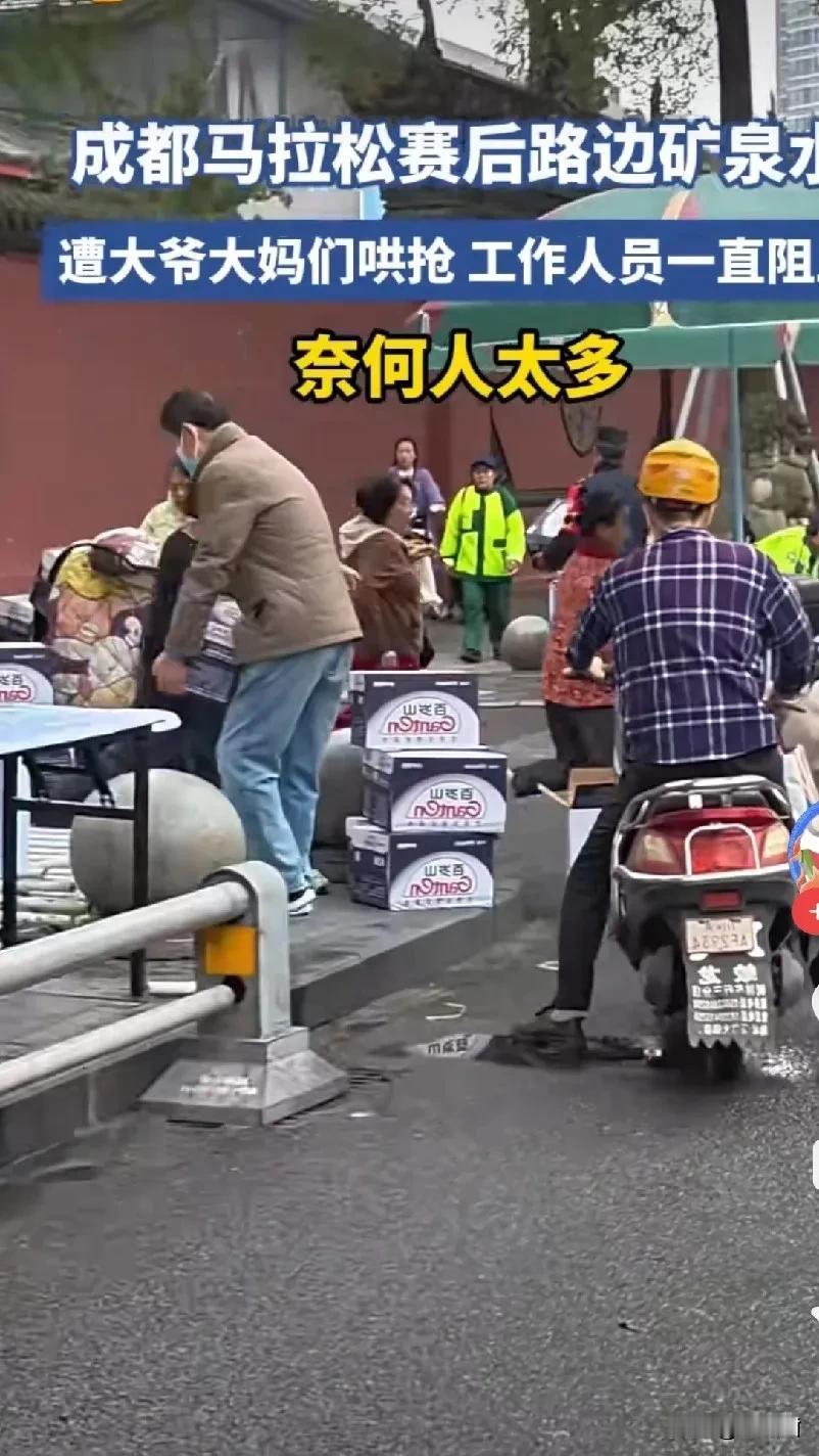 太搞笑了,“马拉松选手”最后一名被劝退,各大市民抱怨交通影响通行,这都不说,离谱的是,给选手准备的矿泉水被疯抢了。 最近成都搞了场马拉松,赛事本身没掀起多大水花,倒是路边的“百岁山”彻底火出圈了。不是因为赞助给力,是被抢得太离谱了! 你猜都是谁在抢?就是平时坐公交,一上车就扶着腰喊“年纪大了站不住”,等着年轻人让座的大爷大妈们。这时候哪儿还有半分“体虚”的样子?路边整箱的矿泉水,别说搬一件了,人家直接两手各提一件,脚步都不带晃的,抬着就往家走。 现场工作人员也拦不住,人太多了,打电话给活动品牌方求助吧,电话拨过去愣是没人接。 这下可好,本来还偷偷摸摸的,一看工作人员管不了、品牌方也不管,越来越多人加入“抢水大军”。更夸张的是,有人直接骑着电动车来,一装就是好几件,一趟趟往回运,那场面比马拉松比赛本身还热闹,真是让人看傻了眼。 (图片来自网络视频)