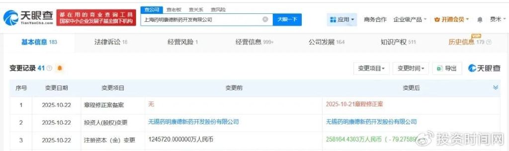 天眼查App显示,近日,上海药明康德新药开发有限公司发生工商变更,注册资本由约124.6亿人民币减至约25.8亿人民币,降幅约79%。