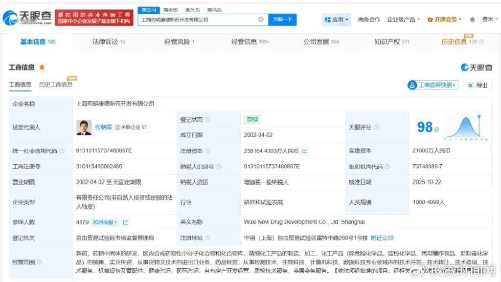 该公司成立于2002年4月,法定代表人为张朝晖,经营范围包括健康咨询、医药咨询、自有房产开发经营等,由药明康德(603259)全资持股。