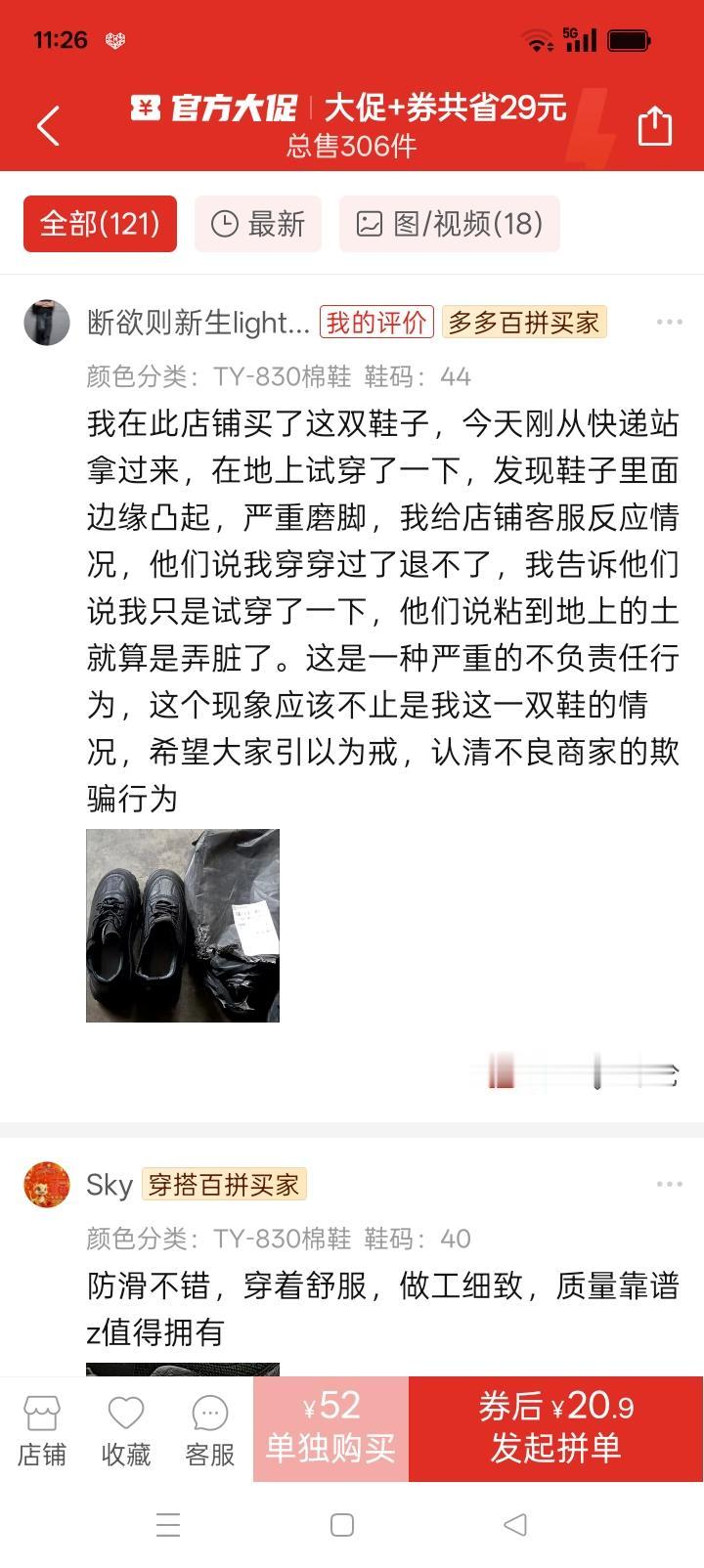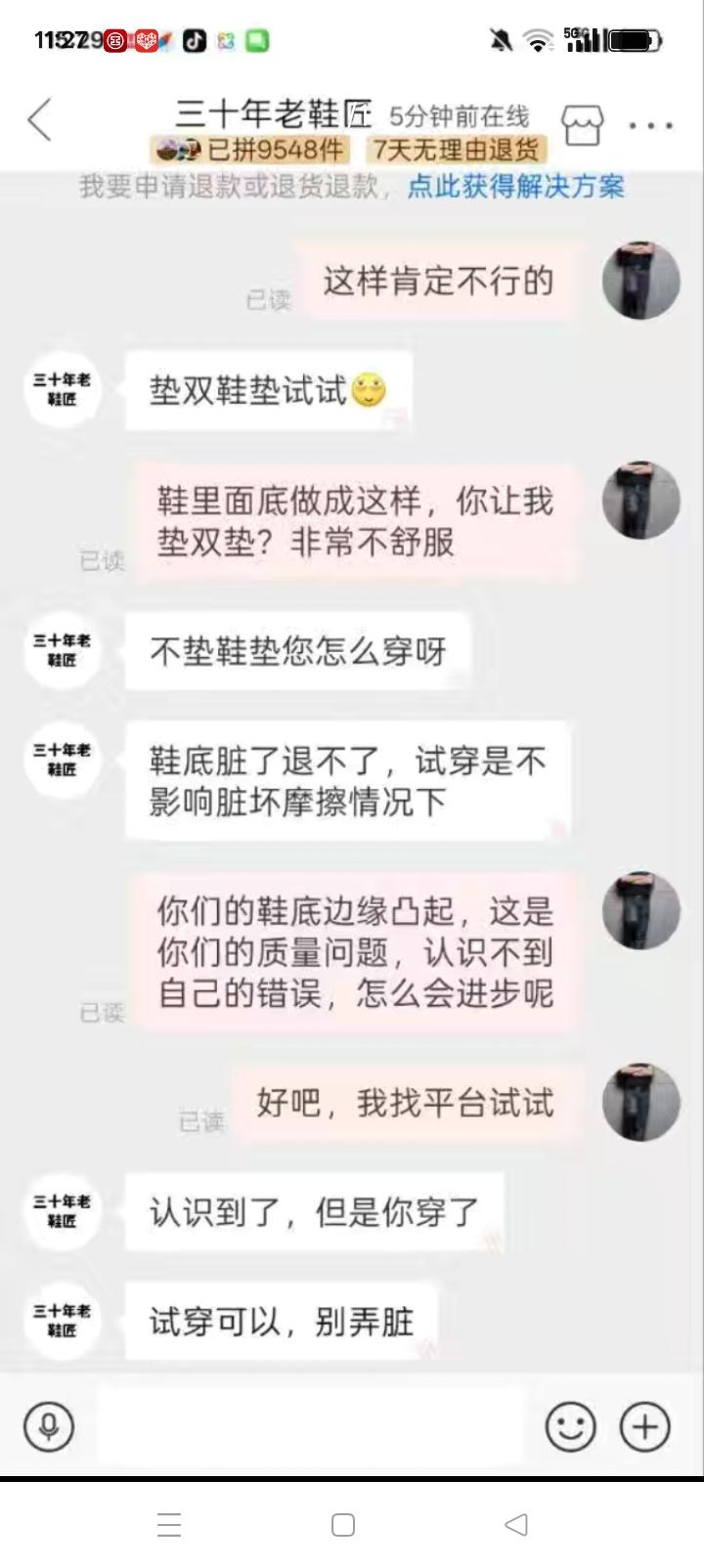 拼多多你让我好伤心,拼多多平台以产品价格低廉,退货快等因素吸引了广大底层消费群体。我同样是它的老客户,平时我买到的东西很少退货,因为我理解它的价格。 可是前几天,我在拼多多平台上买了一双棉鞋,接到信息我马上去快递站领取,回到家后我在厨房里试穿了一下,发现这双鞋里面边缘凸起,磨脚现象严重。于是我和商家客服反映了这个情况,可能是这种现象在他们的产品里普遍存在吧,客服第一时间不是问我具体哪里磨脚凸起,第一句话就让我拍照鞋的外底,我当时还纳闷,是鞋里面的问题,他怎么让我拍照鞋外底面呢?谁知道我拍照后给他们发过去,客服的第一句话就是你已经把鞋底粘上土了,不能退货了。我听候气愤不已,我只是在水泥地面上试穿了一下,怎么就算是弄脏了呢? 这是拼多多商家不负责任的行为,或者说是欺骗消费者行为,这样的现象应该不止我这一双鞋,因为从他们第一时间让我拍鞋底就能窥豹一斑。 本来这只是一次普通的购物,但商家这样的欺诈行为让我很不愉快。于是我就将此次遭遇投诉到了拼多多平台,希望他们能将这种欺诈行为给予适当的惩罚。然而投诉后今天已经是第四天了,平台依然没有给我一个答复,这时候我才明白,商家之所以肆无忌惮的这样干,原来他们有恃无恐啊!我想呼吁拼多多高层领导,如果你们这样敷衍消费者,必将让你们的信誉扫地,失去底层百姓的信赖,也必将为你们这样的不负责任行为付出代价。